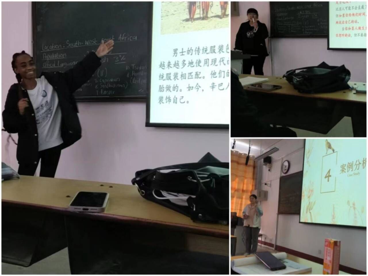 2023年4月7日,在73882必赢网页版跨文化交际的课堂上,由一位外国留学生(琳达)和四位中国学生(刘书楠、杜笑颜、杲文琦、宋鑫雨)共同组成的小组进行了纳米比亚相关的研究成果汇报。汇报分工明确,趣味性强,深入地引领听众走进纳米比亚这一国家。