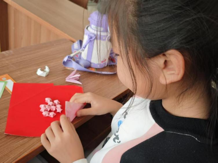 结束课业辅导之后,志愿者们与小朋友进行“创意手工坊”活动,孩子们在志愿者的指导下,动手制作了各种精美的手工艺品,既锻炼了动手能力,又激发了无限创意。其中,一名小女孩用彩纸叠了许多小星星送给了在场的小朋友和志愿者。