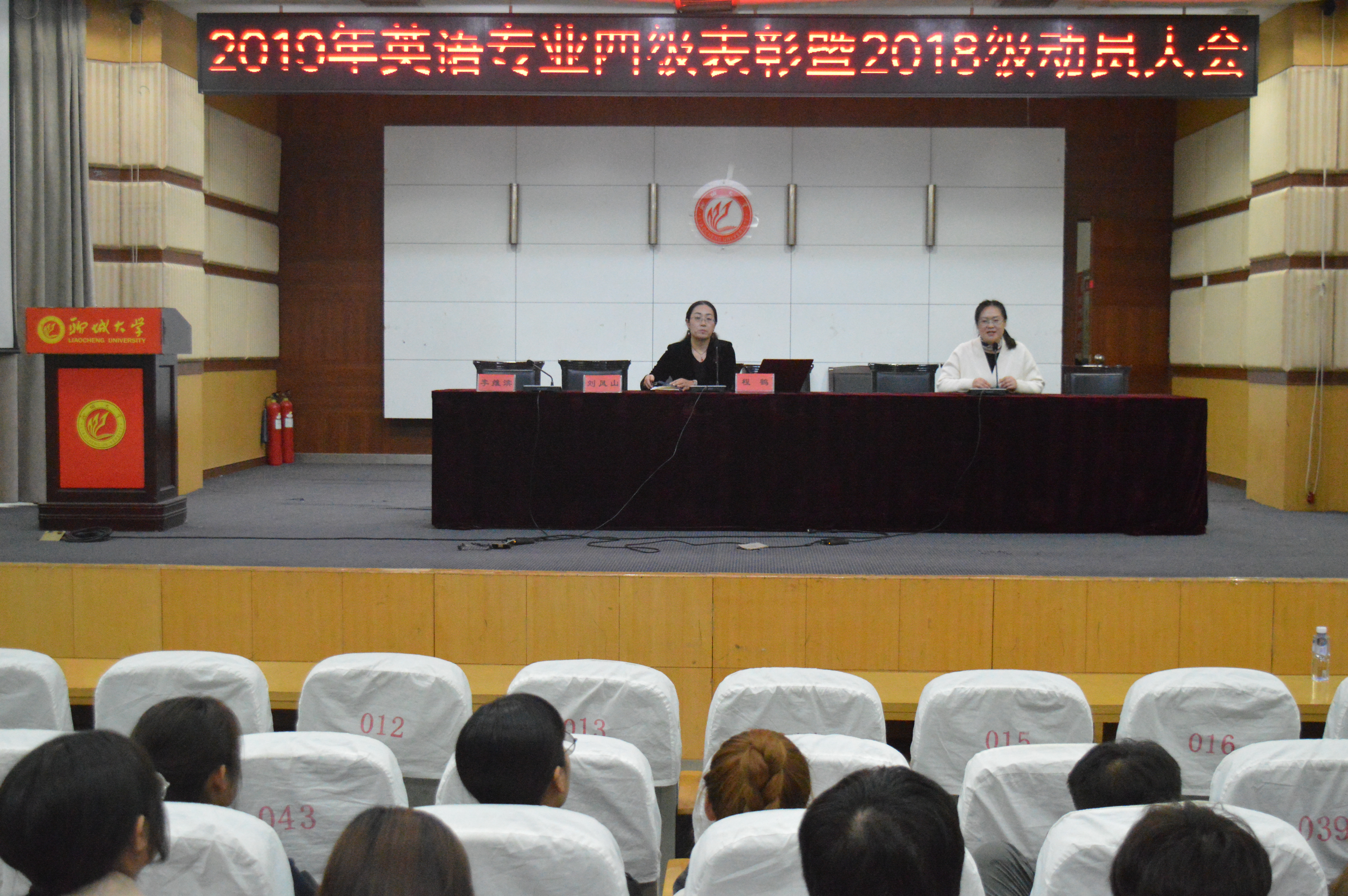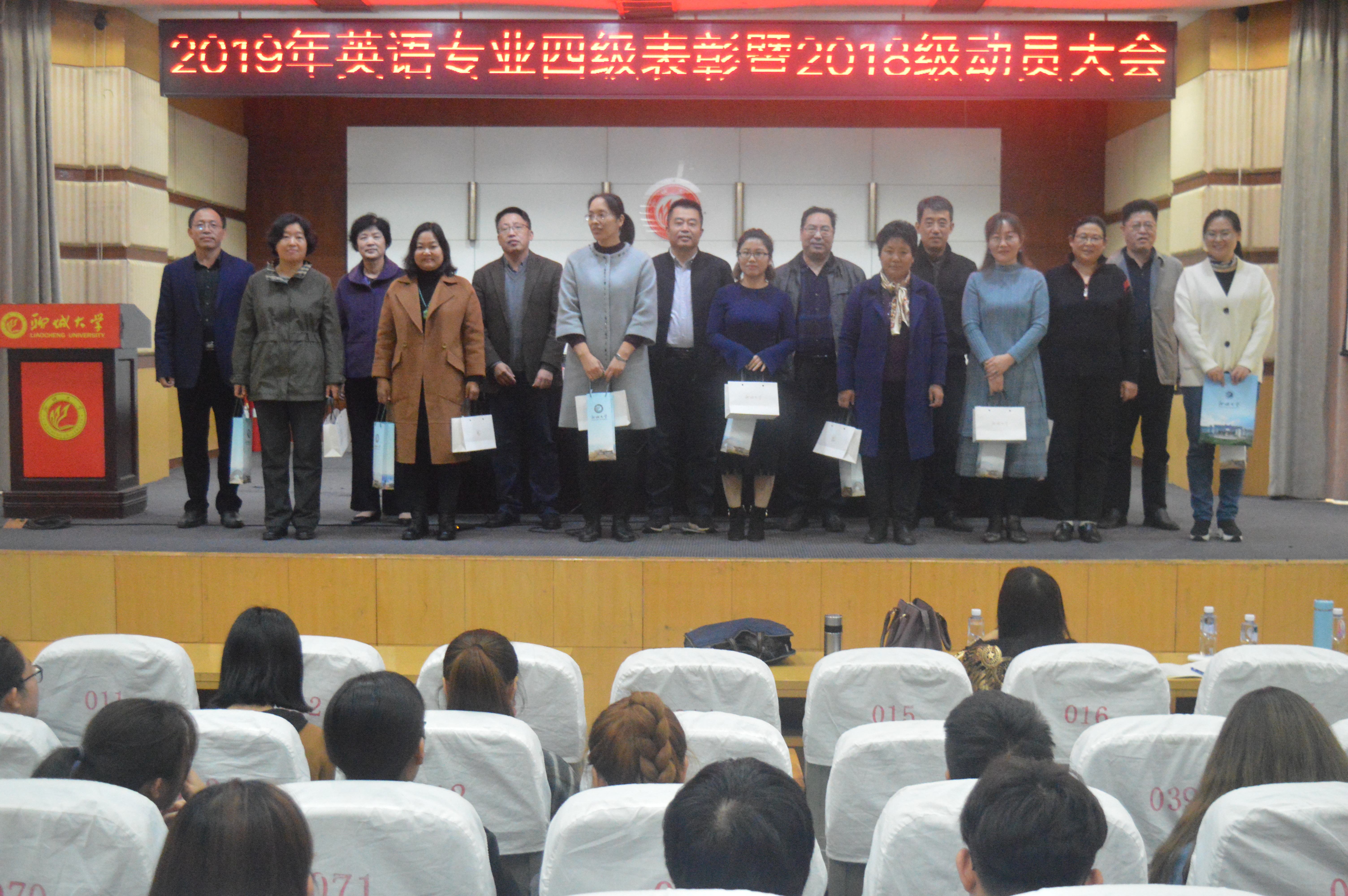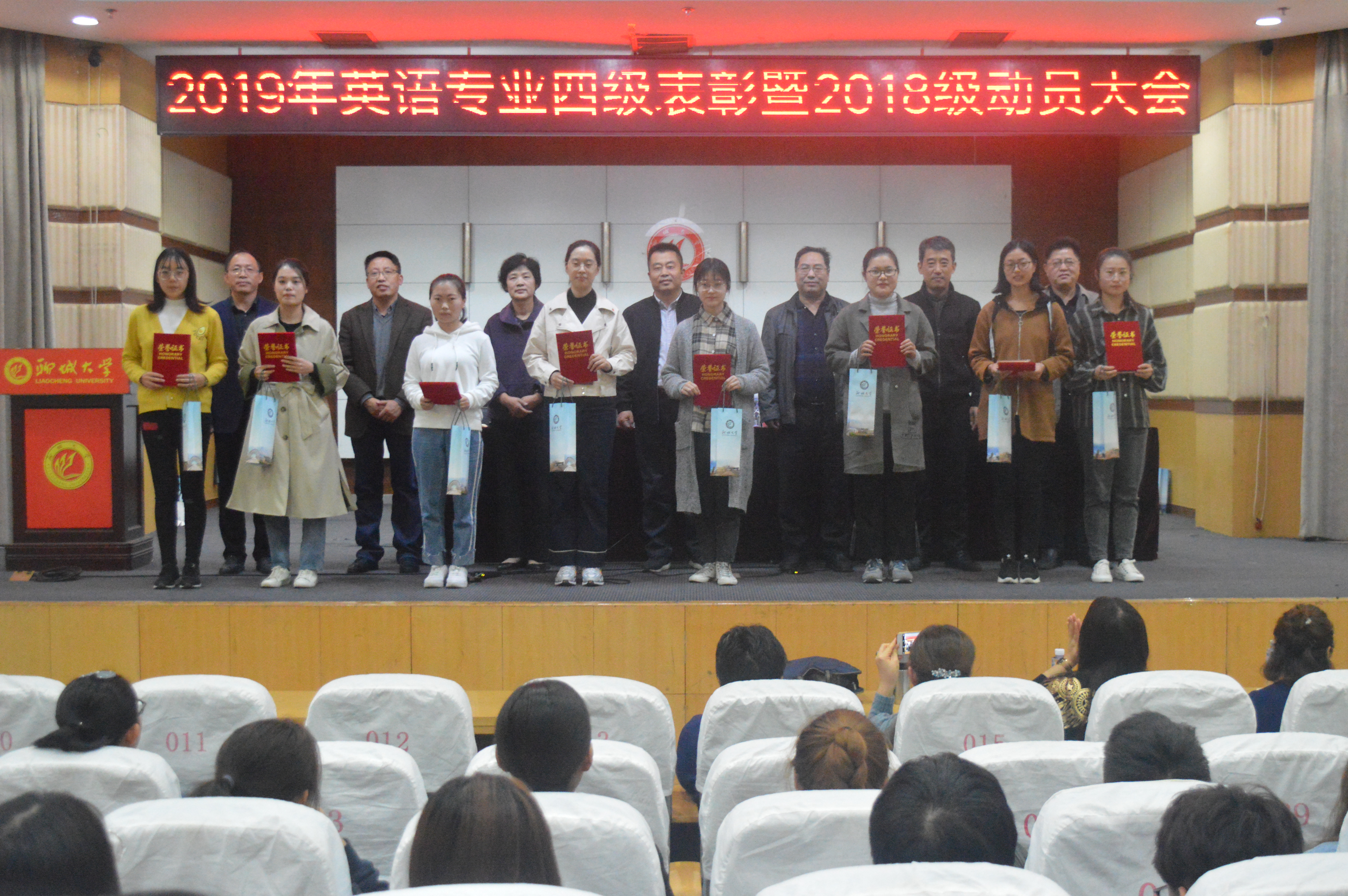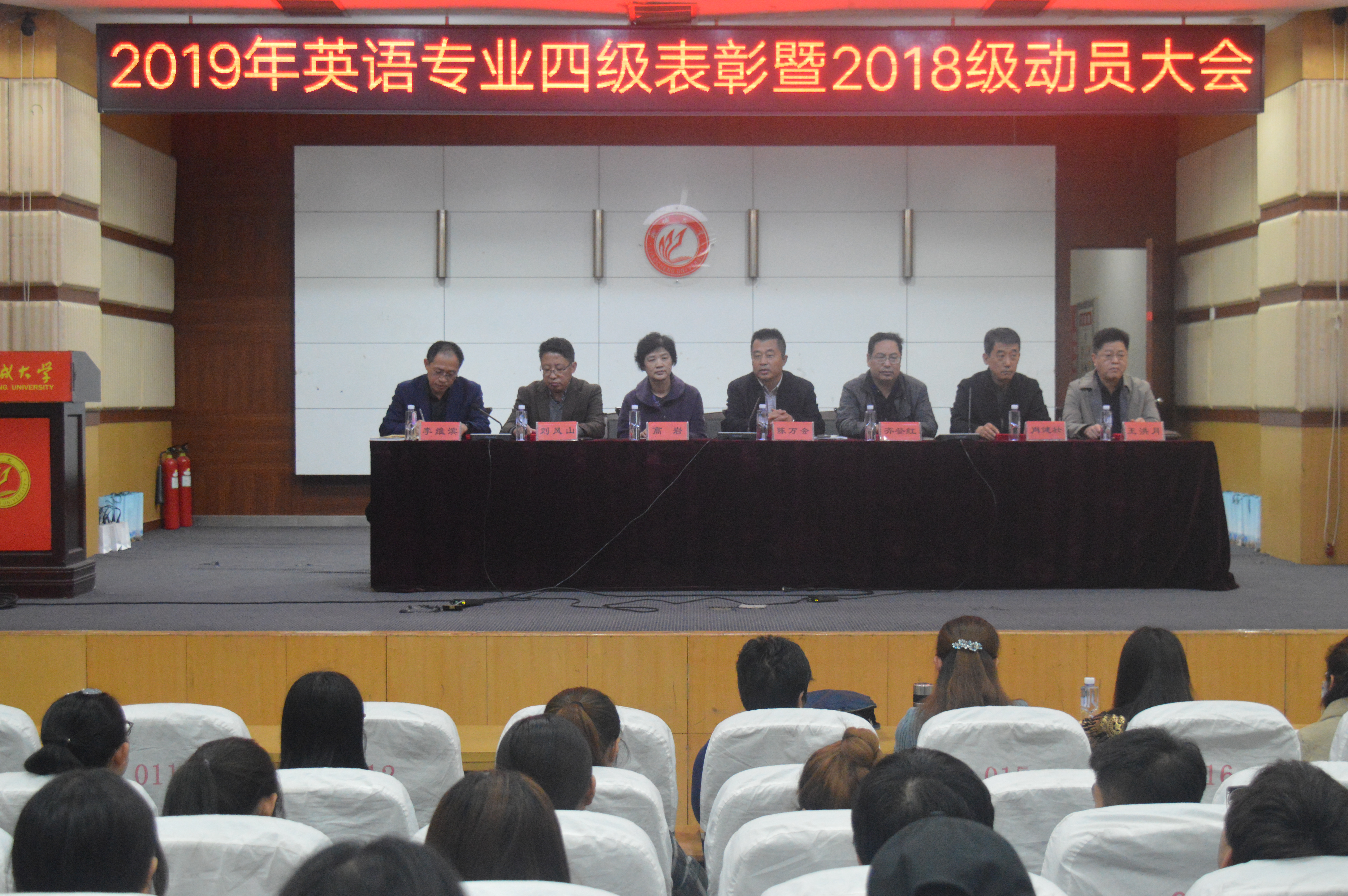 榜样华章,砥砺前行。为提高2018级英语专业同学专业英语四级的备考效率,鼓励同学们积极备战专业英语四级考试,10月31日下午,73882必赢网页版于图书馆大报告厅召开2019年英语专业四级表彰暨动员大会。本次大会由副院长李维滨主持,院长陈万会、党总支书记齐登红、党总支副书记高岩、副院长肖健壮、王洪月、刘风山、英语专业2018级所有专业课教师、班主任、2017级优秀学生代表以及2018级英语专业全体同学参加了本次大会。