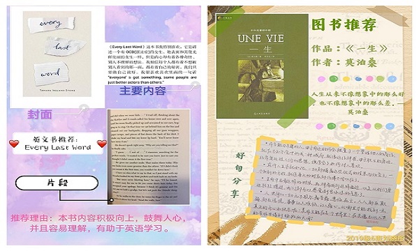 读书使人充实,思考使人深邃,交谈使人清醒。本次活动通过线上的方式,收集到了很多同学的阅读分享材料以及阅读视频。同学们通过分享读书心得,达到相互交流获取知识的目的,很多同学提交的作品是将推荐书籍的封面与文字相搭配,隽秀的文字在传递读书心得的同时也给人一种视觉美的感受,还有同学通过视频的方式,亲自为的大家讲解了莫泊桑的《一生》的重点阅读之处,为同学们分享了书中的名言“人生从来不像想象中的那么好,也不像想象中的那么差”,颇受好评。通过本次线上交流分享活动,希望能激起同学们在家学习的兴趣,让每个家庭书香弥漫。