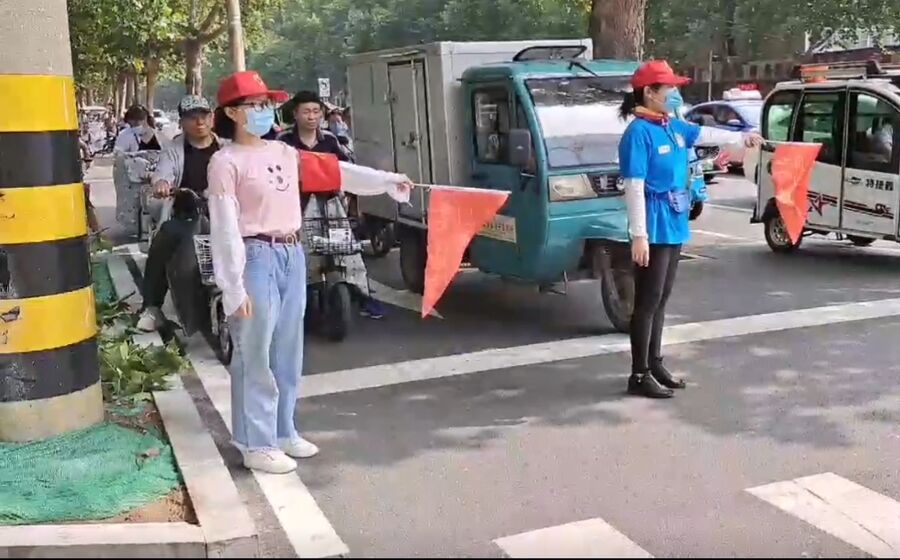 为保证同学们更安全、规范地进行交通指挥,在正式到达交通路口指挥前,社会志愿者为同学们讲解了注意事项和部分突发状况的处理方案,并教会了同学们直行、停止、变道等八个交通手势。同学们经过认真的学习和练习后,同社会志愿者一起来到马路上展开指挥工作。伴随着交通信号的转换和车流人流不同时间段内的变化,同学们始终保持着高度集中的工作态度,心中牢记手势要点和动作规范,力求指挥街道所经车辆和行人安全有序行进。在遇到问题时,社会志愿者也在第一时间上前指导帮助,并不时带领同学们共同进行指挥工作,以使同学们快速适应工作环境,进入工作状态。在出现违反交通秩序的现象时,同学们及时阻拦,随社会志愿者一同进行劝导和交通规则普及。在看到行动不便的行人过马路时,同学们会及时上前搀扶,并将行人安全送至马路对面。尽管烈日当头,辛苦劳累,但同学们依旧认真标准的站在自己的工作岗位上完成工作,获得了社会志愿者及过往路人的肯定。
