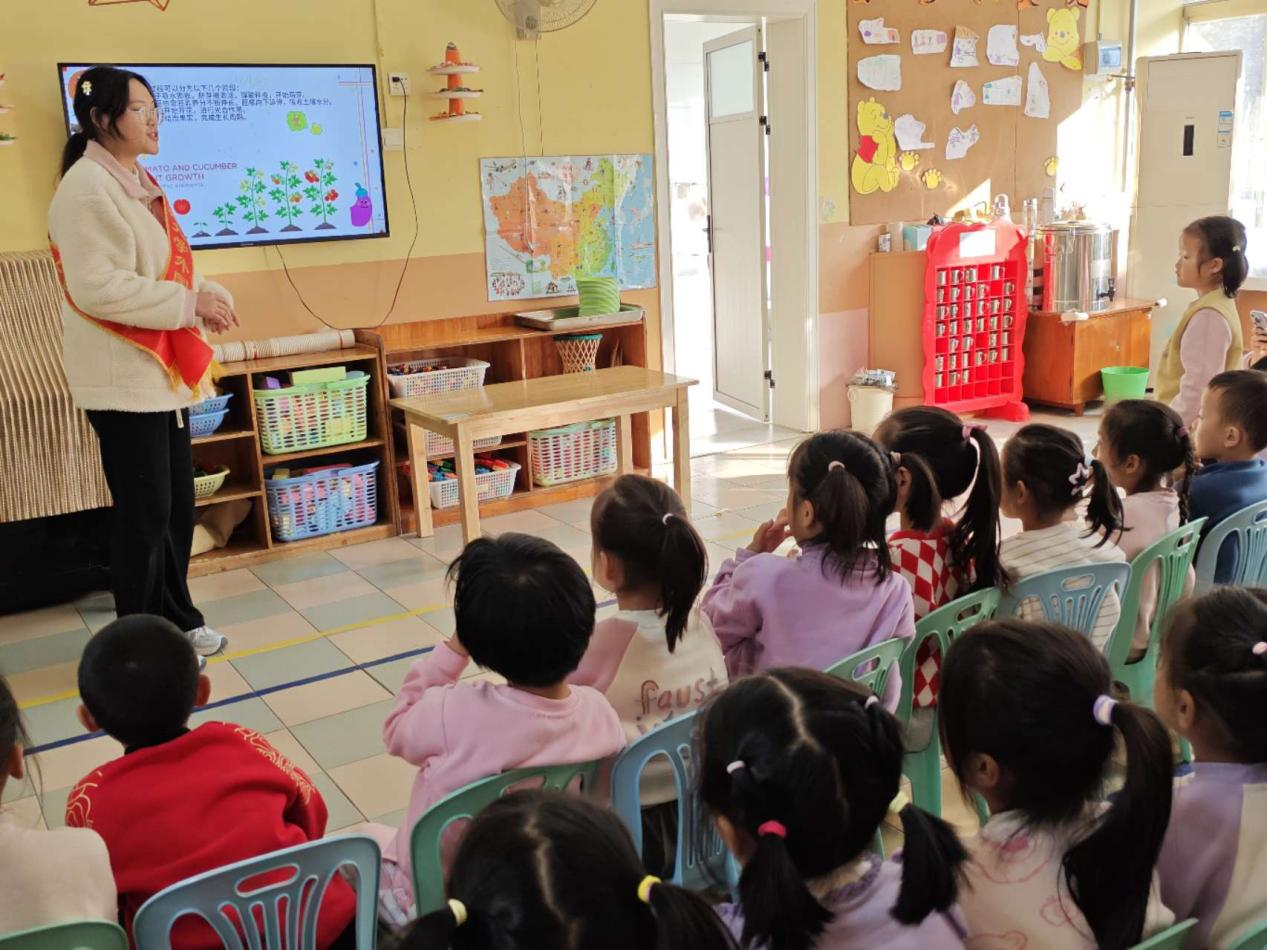 活动当日,志愿者们围绕“蔬菜”的主题展开英语教学。在教学过程中,主讲志愿者先给幼儿园小朋友们播放了一段“蔬菜英文儿歌”的视频,轻快的节奏和动人的旋律瞬间抓住了小朋友们的注意力,他们纷纷跟着音乐摇摆,学习热情被迅速点燃。紧接着,志愿者们抓住时机,趁热打铁,带领小朋友们逐一认识了生活中常见的蔬菜,如白菜、黄瓜、西红柿等,并耐心教授了这些蔬菜的英文单词。课堂上,小朋友们学习热情高涨,他们积极与志愿者们进行互动,争相举手发言,课堂气氛非常热烈。