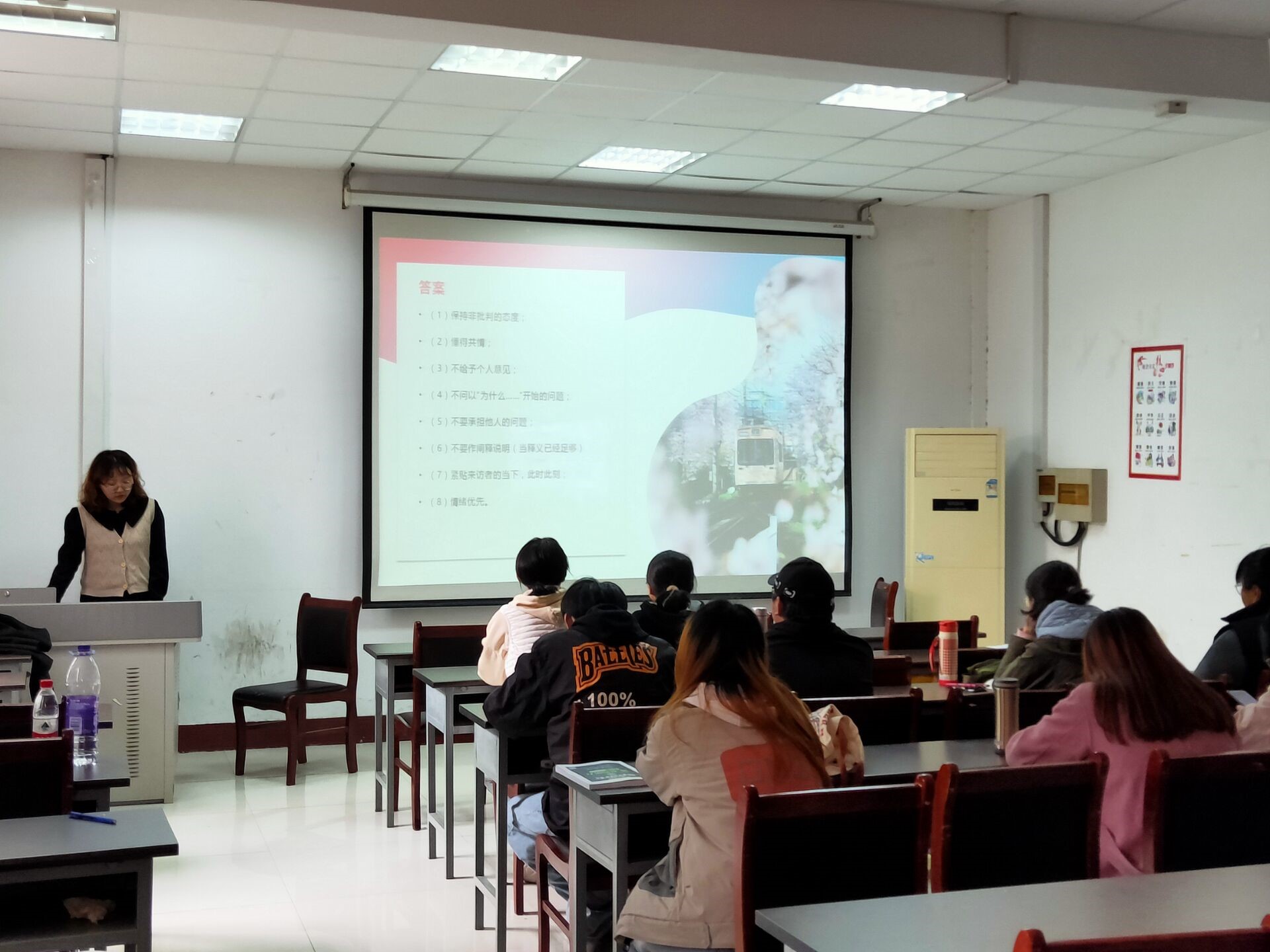 此次活动由朋辈辅导队骨干柴梦婕同学主持,她首先给大家阐述了朋辈心理辅导的八项原则,积极引导同学们学会心理调适的基本技巧,有利于促进大学生身心健康的发展。其次,她通过心理小短片和简单的情景演练帮助我们辨析同情与共情的不同,加深了朋辈辅导员对相关心理知识的理解,对今后校园心理活动的开展提供了有力的支持。活动的最后,宣讲人通过心理学家的名言对此次培训进行了总结归纳,解答了同学们的疑惑,让参加活动的朋辈辅导员及心理部成员了解如何引导同学缓解心理压力,调整良好的心态,进一步强化了大家的心理素质。