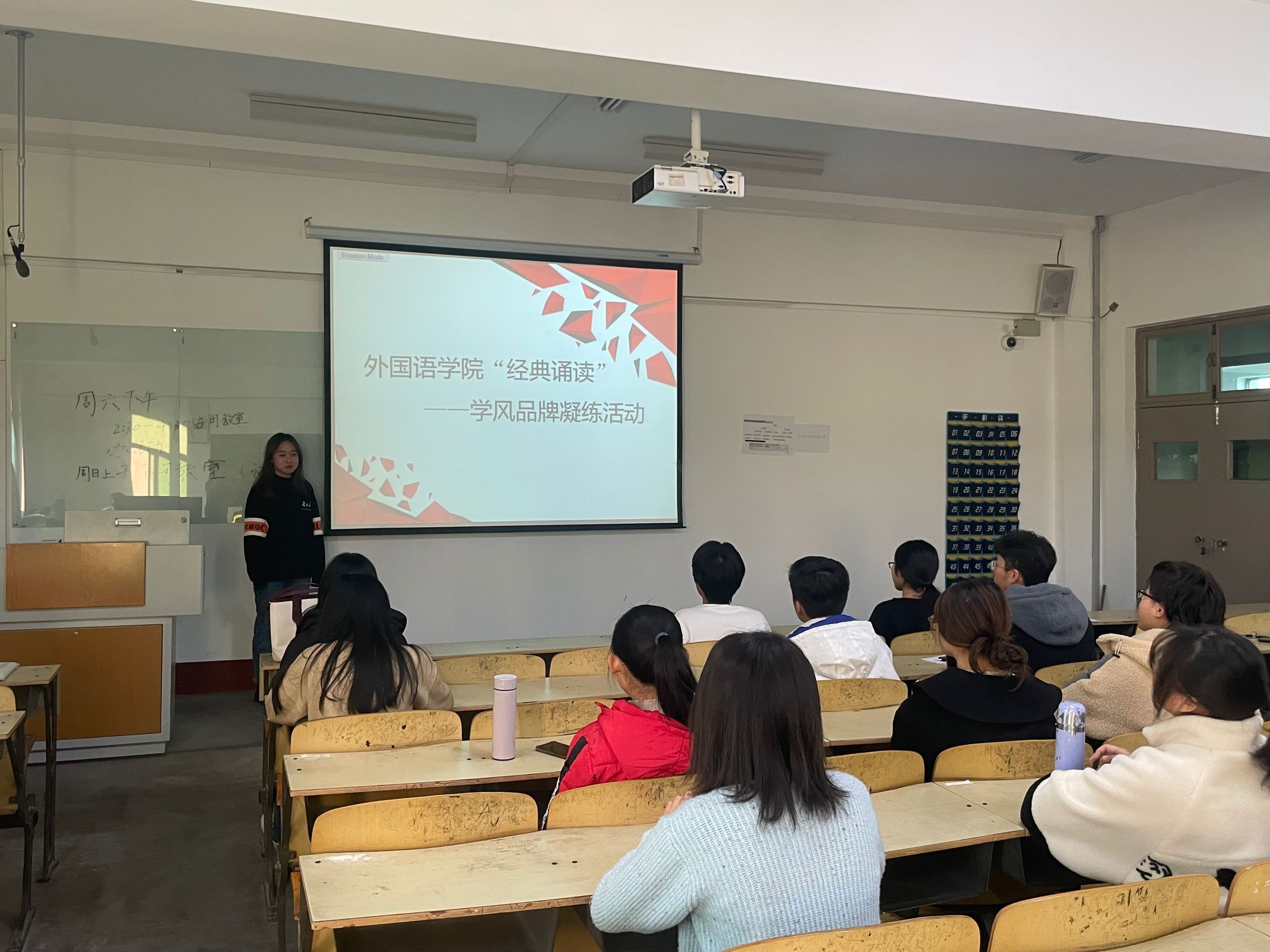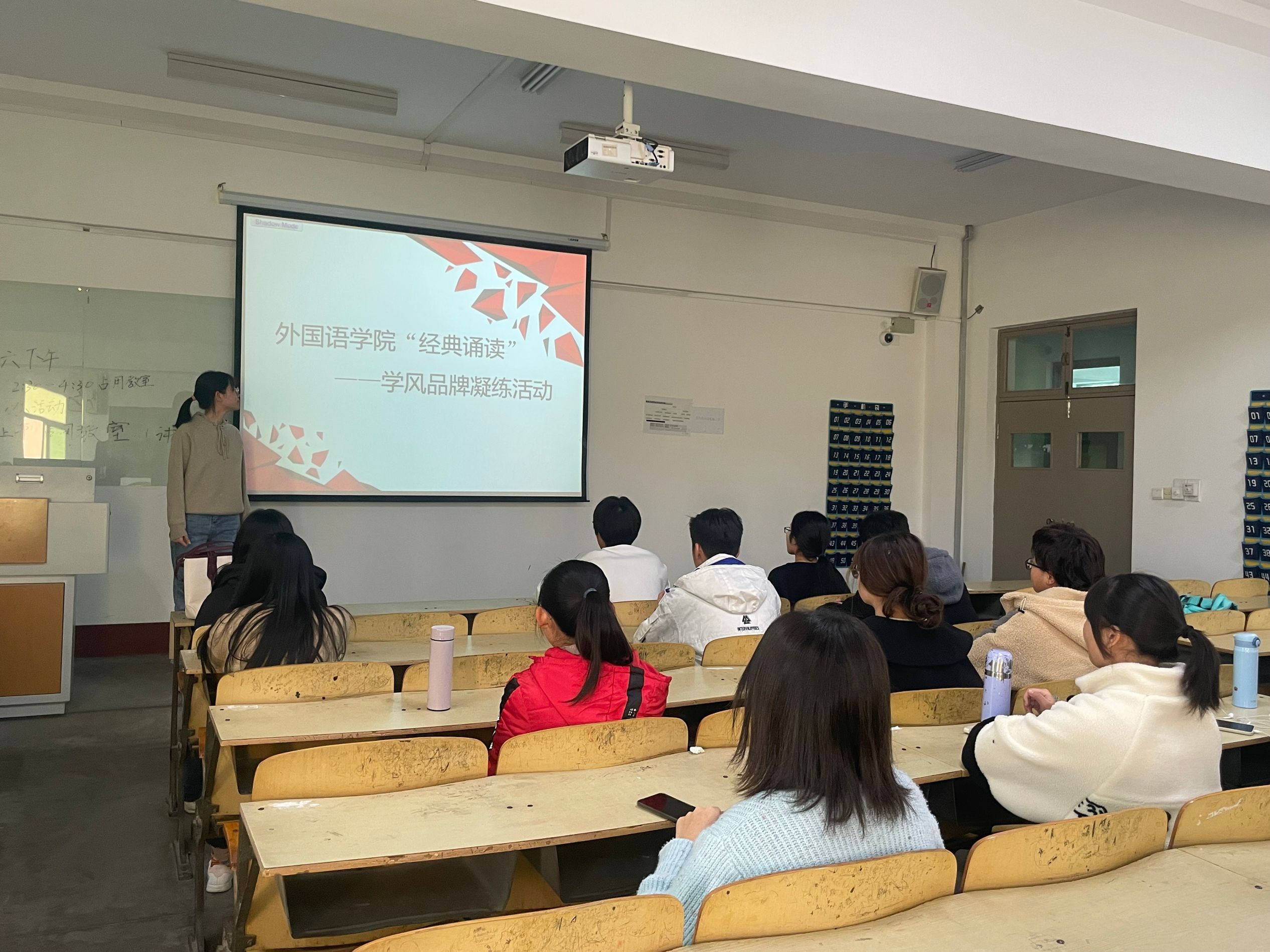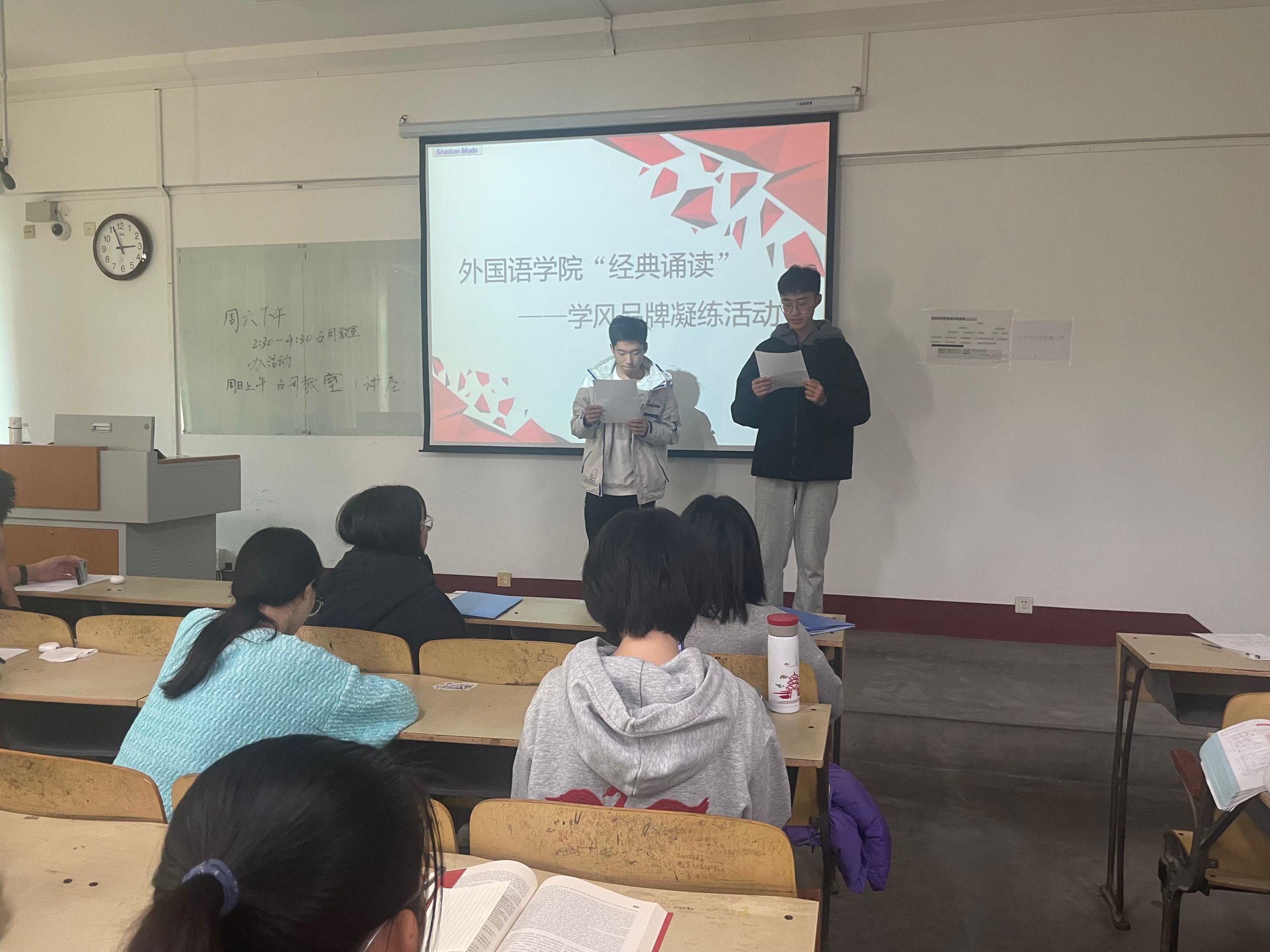 本次活动的诵读篇章自定,以小组或个人形式进行诵读。活动开始之初,负责人引导同学们佩戴口罩间隔就座并介绍此次活动内容。诵读活动开始,学生在开始诵读前首先说明了自己朗诵的书名,他们的选定书籍或对英语学习有益的经典作品,或是具有较强时代性和实用性的,内容丰富多彩的报纸,如《二十一世纪报》、《英语辅导报》、《英语周报》等。诵读此类英语文章不仅有利于开拓学生的视野,更有利于促进学生的英语学习。诵读的过程中,同学声音洪亮、富有感情,每位同学进行了2-3分钟的诵读并就刚才自己所诵读的内容简单分享自己的感悟,提高对经典作品的剖析能力。最后,所有同学诵读完毕后,有序离场。
