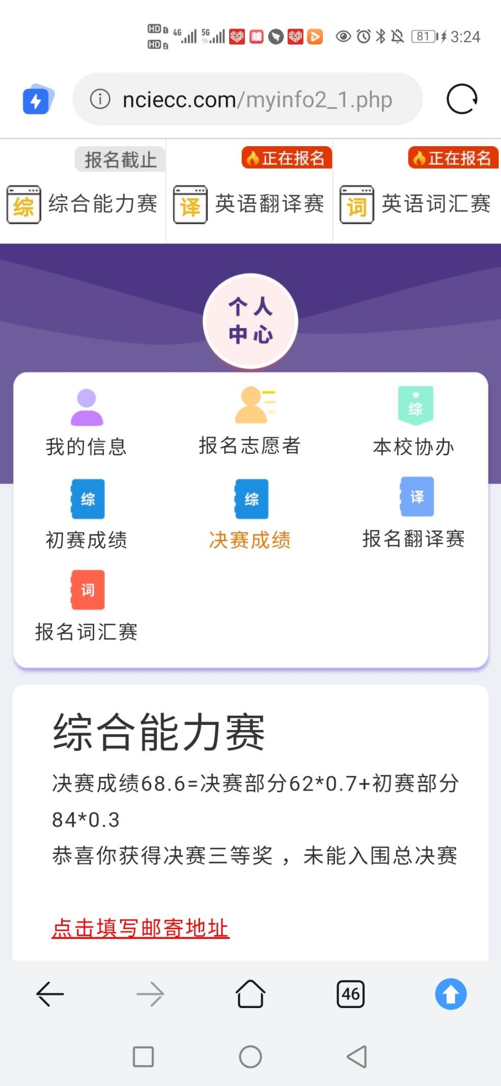 73882必赢网页版学生刘文睿在2021年第三届全国高校创新英语综合能力赛决赛中荣获三等奖,刘文睿在日常生活中脚踏实地,努力丰富自己的知识,为此次比赛的成功打下了坚实的基础,在此,对刘文睿致以最真诚的祝贺。