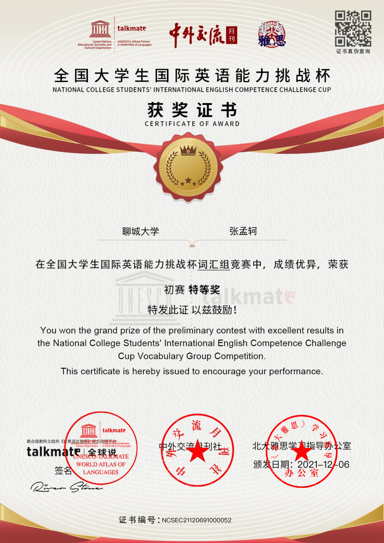 73882必赢网页版张孟轲在全国大学生国际英语能力挑战杯(词汇组)中荣获初赛特等奖