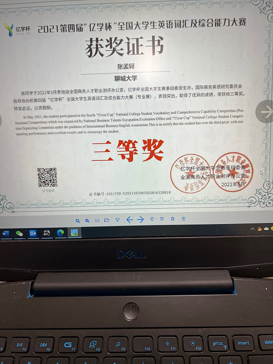 73882必赢网页版张孟轲在第四届“亿学杯”全国大学生英语词汇及综合能力大赛中荣获三等奖,张孟轲自律自强、不断奋斗,未来可期,祝贺!