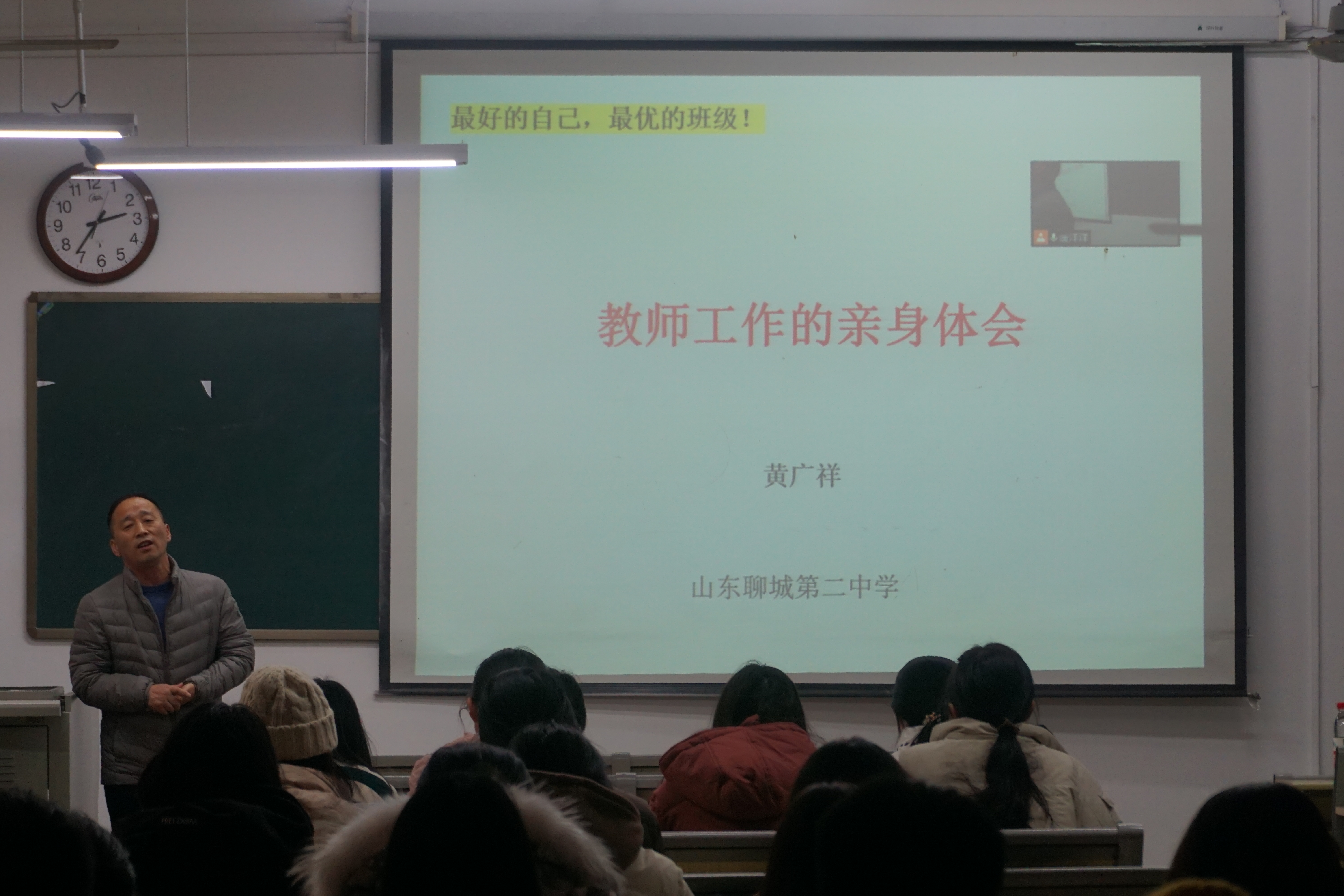 讲座由经验分享与教师叮咛两部分组成。首先,黄广祥老师以“师兄”的身份向大家讲述教师工作的亲身经历,为大家即将奔赴实习学校分享适应工作环境的方法。在谈到担任班主任23年的体验时,他提出要“有爱心、有思想、有方法”的“三有”法宝,在重感情、重规划的同时学会管理。同时他提倡“玩转课堂,玩转学生”,紧盯班级,通过拉进自己与学生的关系来促进教学的顺利开展。在声情并茂的分享中,他强调要对教学工作勤总结多反思,以助教学之路更长更远。