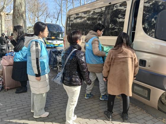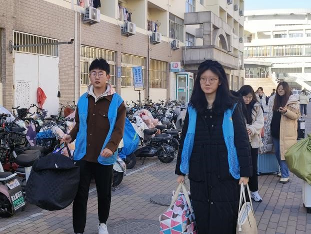 正值春暖花开时节、乍暖还寒时候,早上九点钟,志愿者们准时到达宿舍门口帮助支教学生们搬运行李。志愿者们身穿蓝色马甲,热情开朗,脸上洋溢着笑容,为了更高效地搬运行李,他们活力满满地用电动车驮运行李,省时又省力。在行李搬运过程中,老师们也来到宿舍楼前帮忙维持学生们的纪律,与志愿者们一同行动。老师们担心支教的学生们会出现一些心理问题,在他们上车的前一秒仍在传授经验,浓浓师生情感人至深,整个学校弥漫着温馨的气氛。老师们目送即将远行支教的学生们,欣慰又自豪。看着那些帮助他们的志愿者和老师们,支教学生们纷纷表示会努力学习,认真支教,不辜负母校的期待与信任。