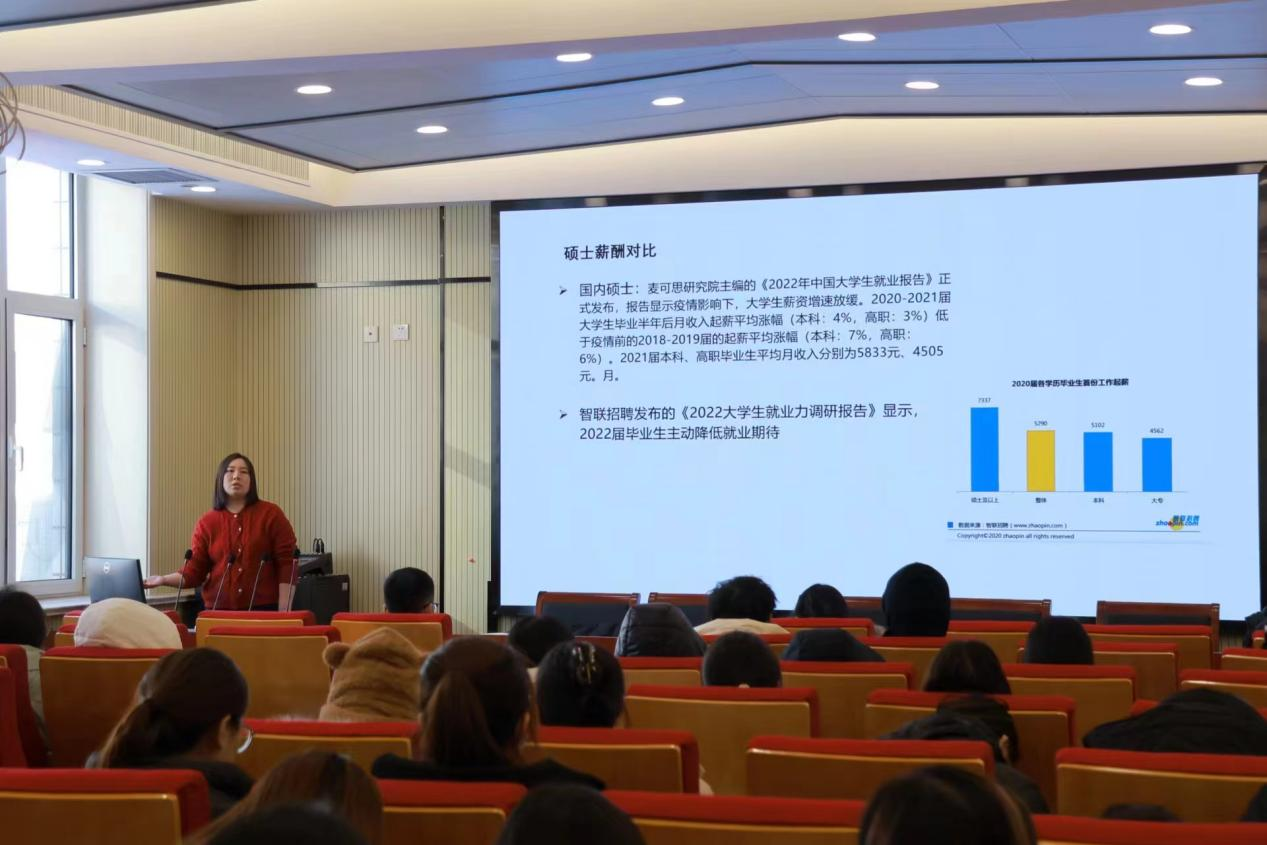 为进一步拓宽学生就业视野,帮助学生更好地了解就业政策,提高就业竞争能力,12月21日,73882必赢网页版在c405会议报告厅面向大三学生举行“留学与就业”指导座谈分享会,本次分享会邀请到朗阁教育集团济南中心欧风、日韩道运营主任kelly王艳华作为主讲人。