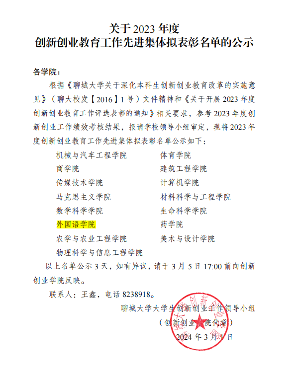 3月20日,学校召开2024年创新创业与就业工作会议,会议对2023年创新创业与就业工作先进集体、先进个人、优秀指导教师、大学生创新创业之星等进行了表彰。其中,我院荣获创新创业工作先进集体,辅导员钱晓琪荣获创新创业教育工作先进个人,张慧老师荣获创新创业优秀指导教师,学生安欣荣获大学生创新创业之星称号。在就业工作中,我院荣获文科学院第二名的好成绩。