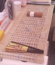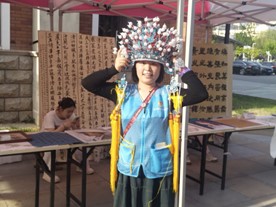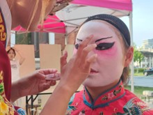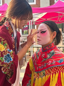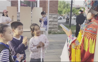 此外,慕曲京剧社代表团还带来笔、墨、纸、砚,在一撇一捺间挥毫泼墨,在行云流水中尽显中华传统艺术文化的魅力与风情,也彰显出京剧社成员在文化交流传播过程中的自信与热爱。此间,老人和小孩也被相继吸引而来,体验者身着华丽戏服,粉墨登场,慕曲代表团成员为其朗诵《长相思》等诗句 ,引得围观人群的阵阵赞叹。
