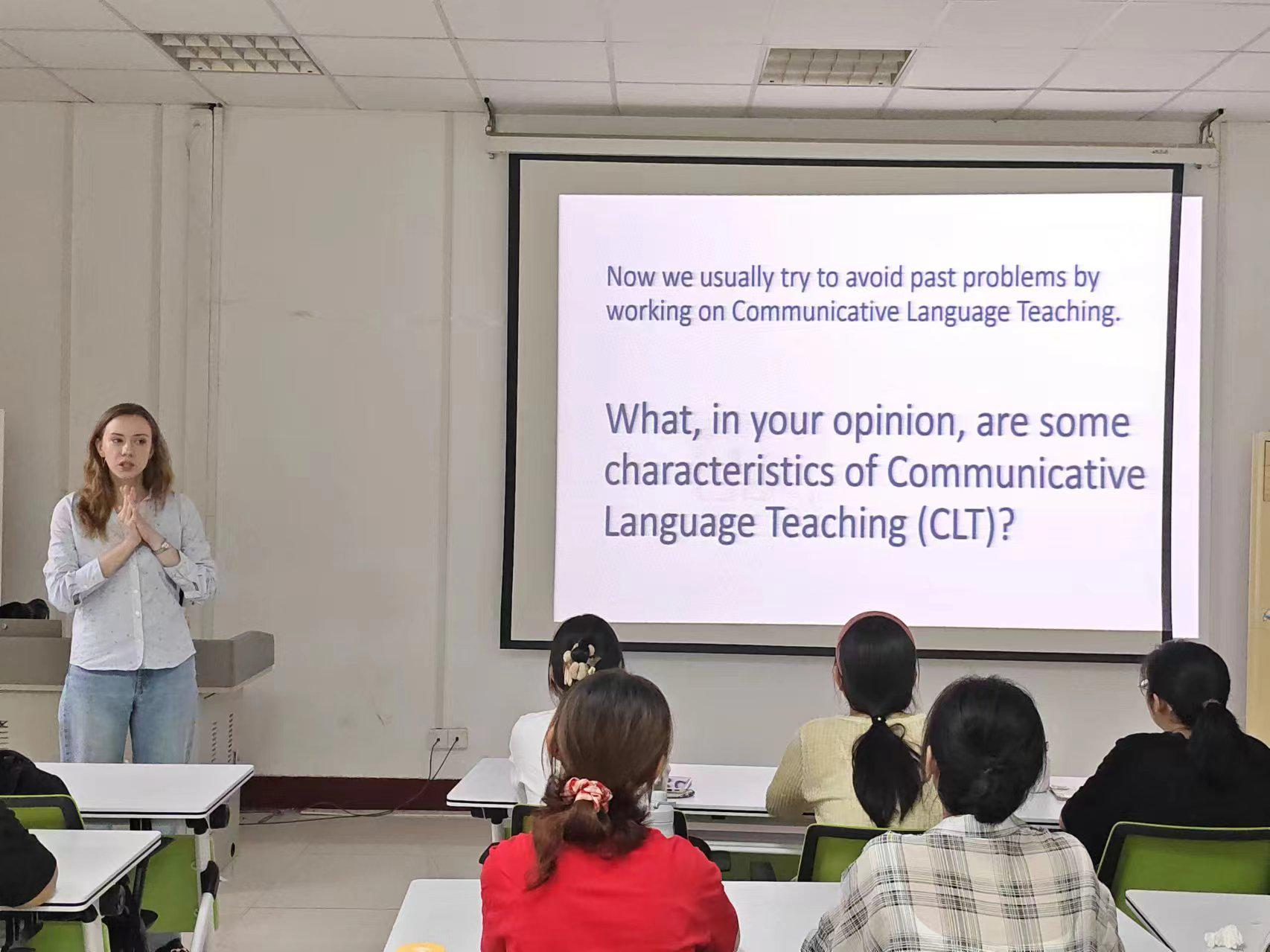 讲座伊始,Hanna抛出“我们为什么要学习语法”的问题,为引出讲座主题做铺垫,同时引导学生进入学习状态。接着,她简单介绍了语法教学简史、教学原则等内容,让学生对“语法”这一概念有整体性的把握,随后,Hanna以一首简短的歌谣为例,带领学生剖析其中蕴含的语法点。她总结出三个交际语法的原则,希望学生能重点记忆。Hanna指出,流畅的口语表达要以精准的语法技巧作为支撑。本次讲座施行分组教学的模式,最大限度地调动了在座学生的参与热情,他们大胆进行口语表达,勇敢地输出观点,现场气氛活跃。在大家热烈的掌声中,本次讲座圆满结束。与会学生们纷纷表示深受启发、受益匪浅。