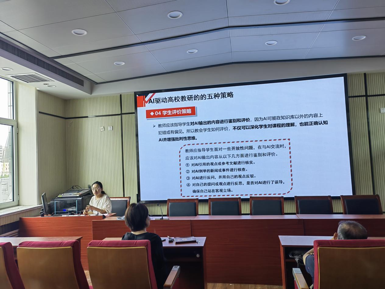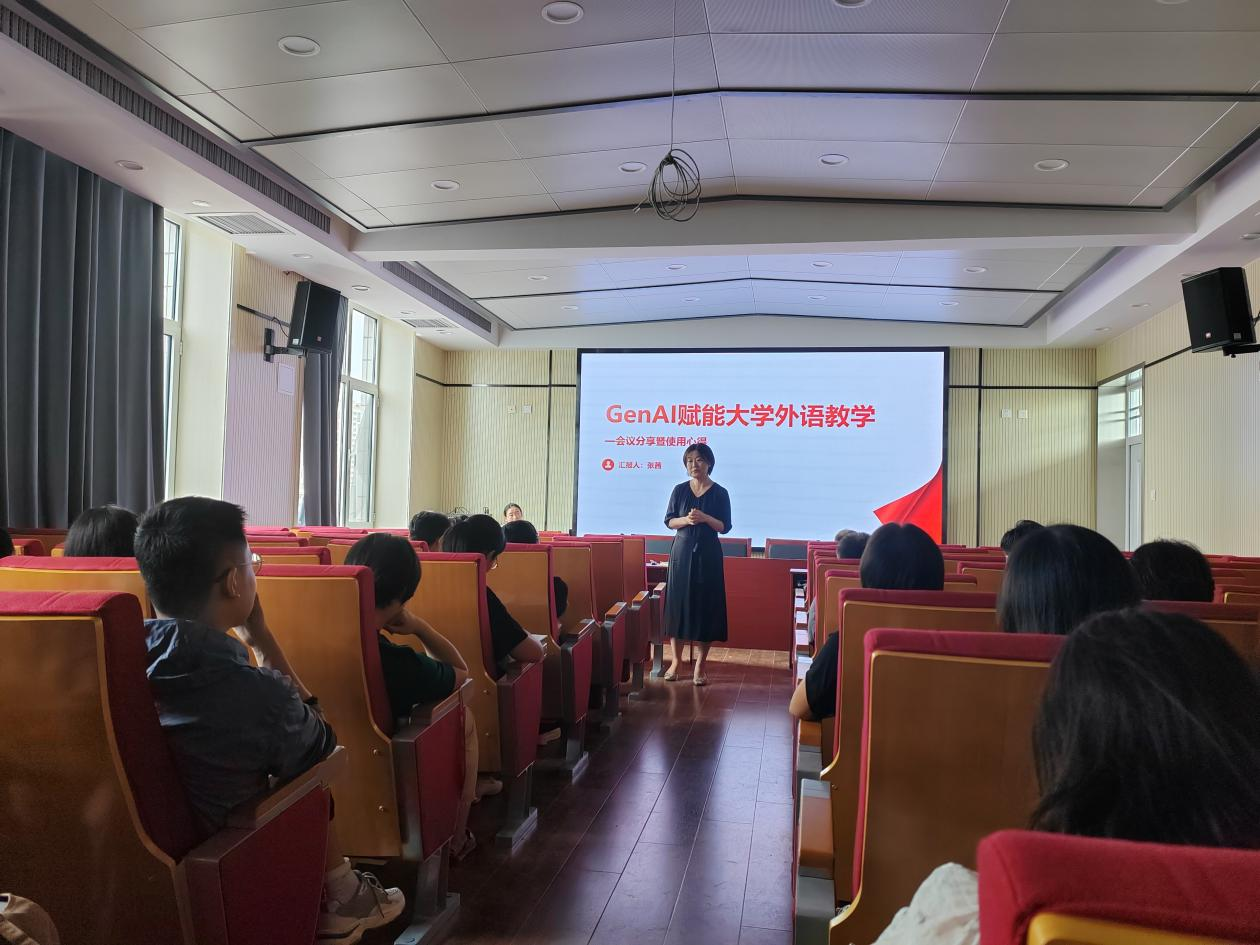活动伊始,李燕飞副院长强调了在当前教育数字化转型的大背景下,GenAI工具赋能教学、教研和科研,对于提升教学质量、促进教育创新和科研创新的重要意义。随后,张茜老师结合参加成都GenAI赋能教学与教研培训班的内容及个人使用心得,进行了题为“GenAI赋能大学外语教学”的教研分享,为教师们带来了诸多启示与思考。