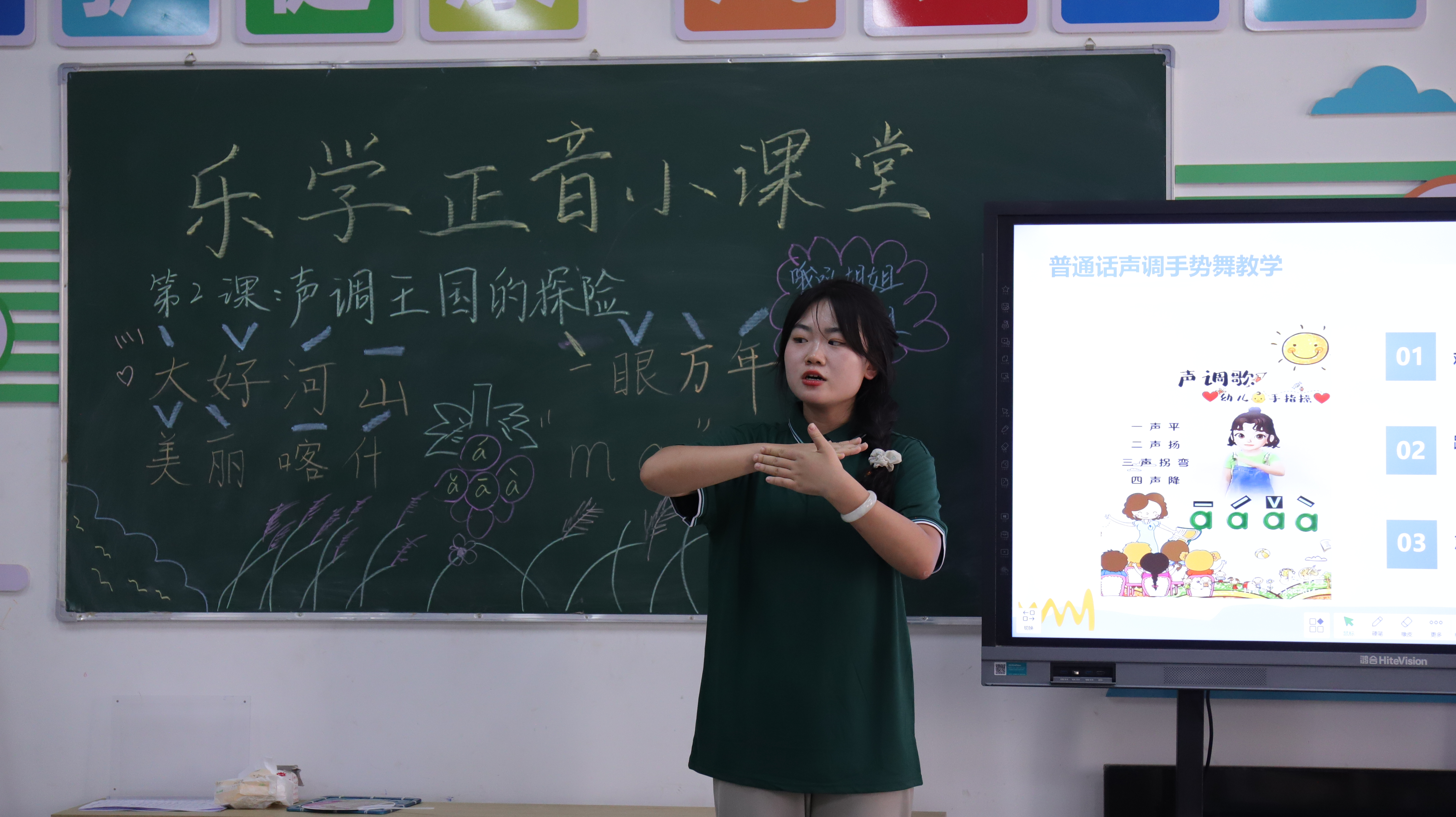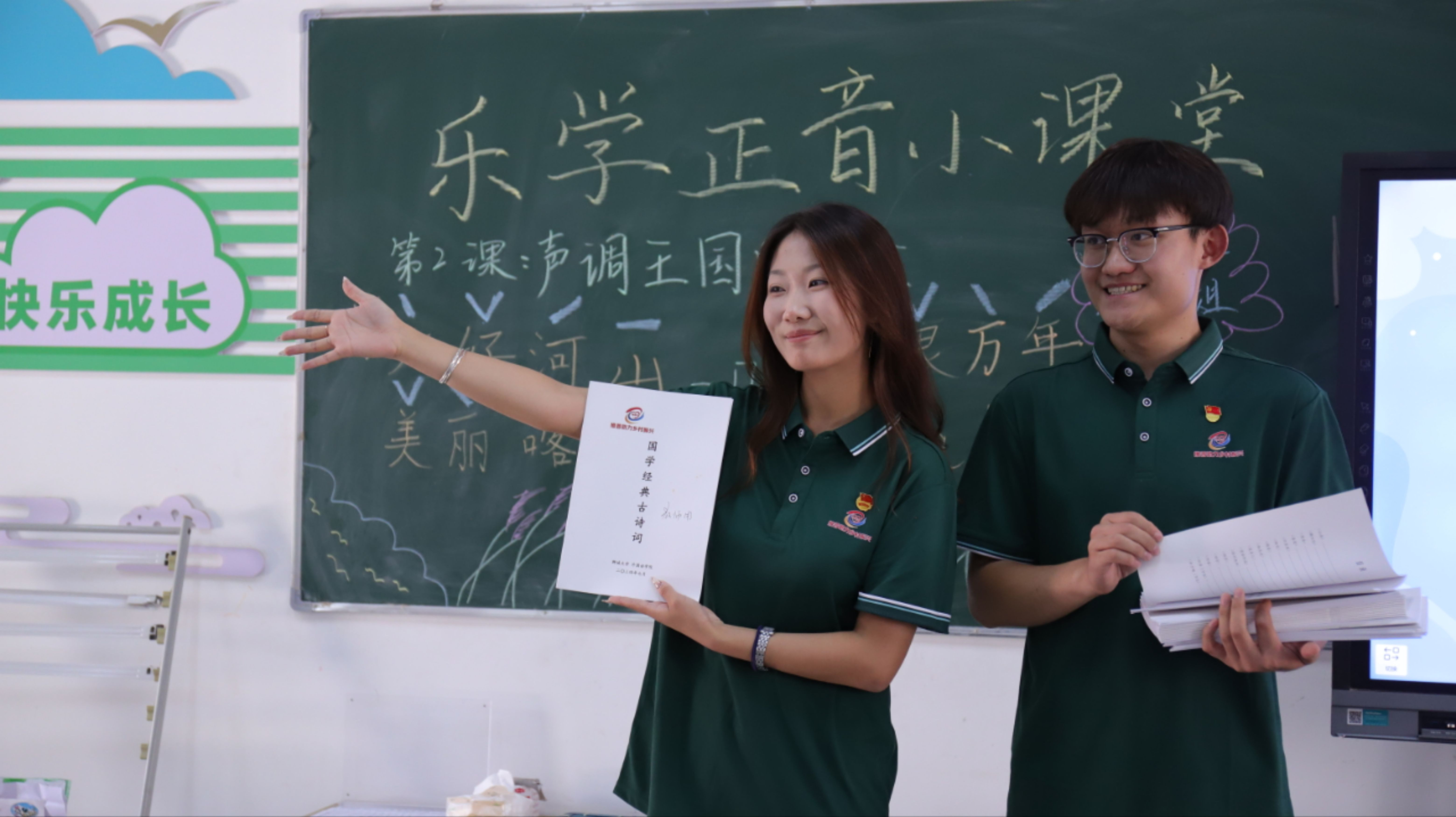 “云对雨,雪对风,晚照对晴空......”,为高效促进正音启蒙,志愿者们以手势舞的形式教学生诵读中华传统经典《声律启蒙》,鼓励学生积极调整语音、语调。在国学诵读过程中,学生们表现活跃、主动展示,不仅学习了普通话的标准发音,还领略了中华文化的音律之美。