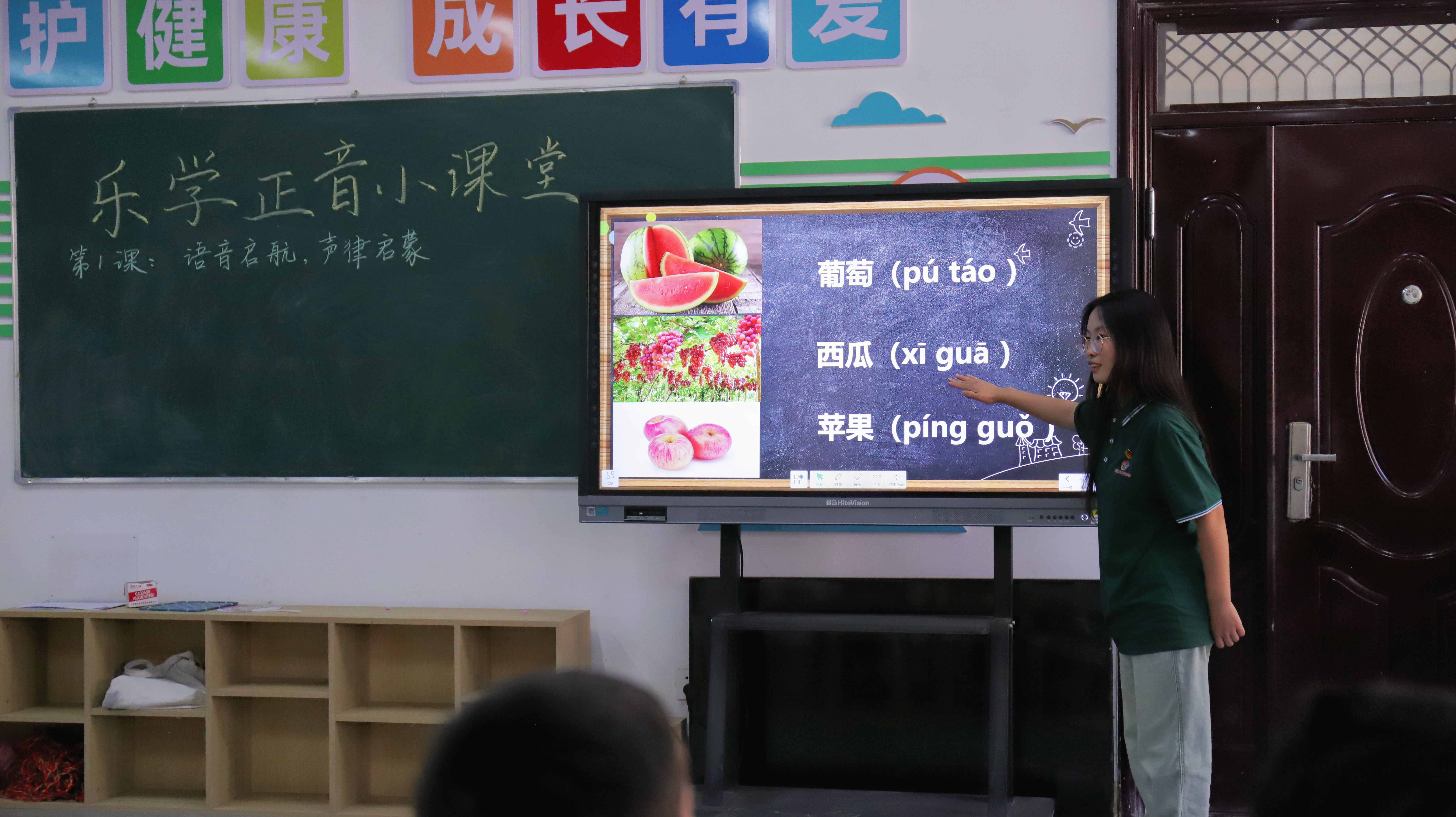 在乐学正音小课堂上,志愿者们以“”新疆特色水果”与“”拼音配对”等小游戏引入,对社区儿童开展普通话声母、韵母基础知识教学;课堂通过拼音操、“绕口令”闯关等趣味互动,不仅夯实了正音基础,而且激发出孩子们对于学习普通话的热情。