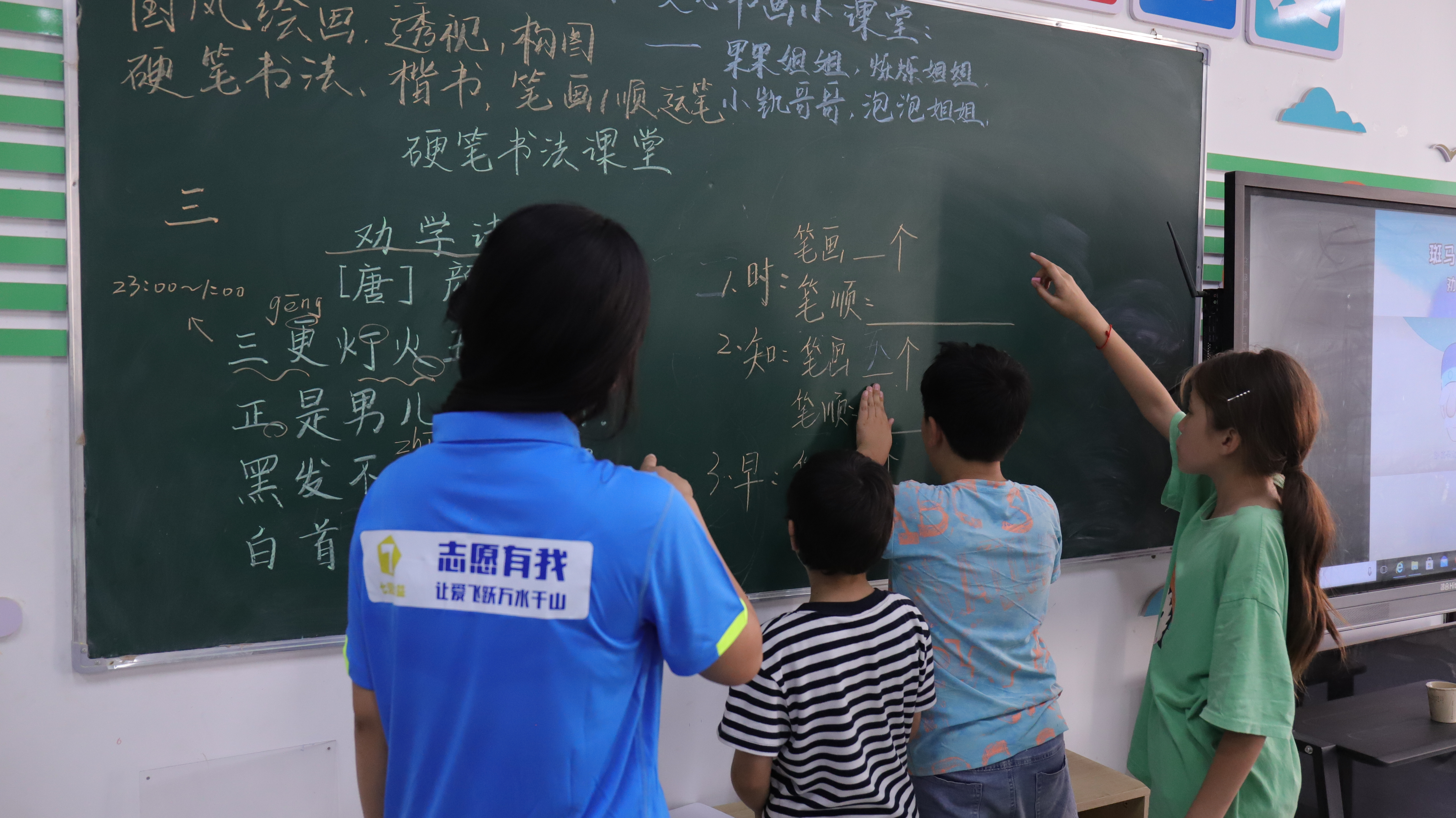 (图为“丹青绘疏勒”文心书画课堂上志愿者教习硬笔书法与国风绘画)