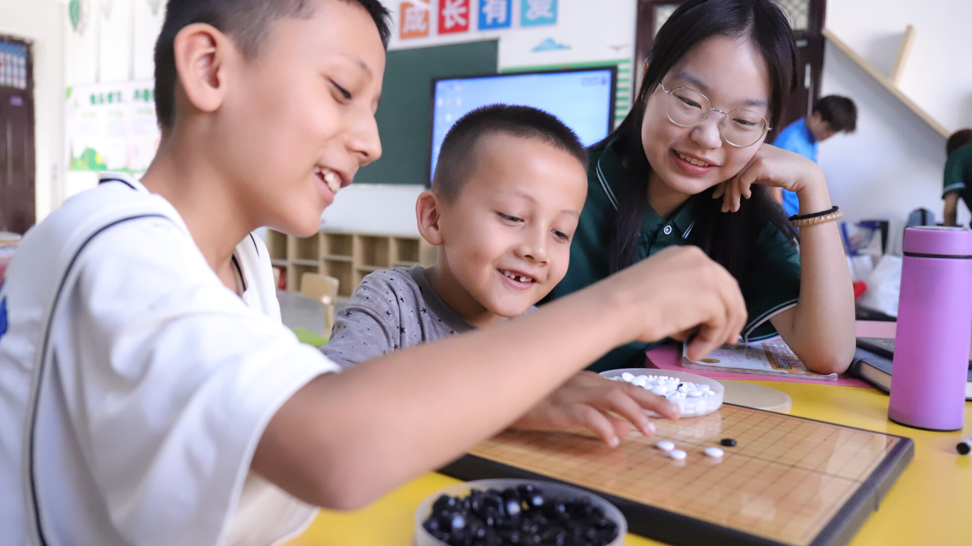 (图为课间活动时志愿者与学生参与下棋)