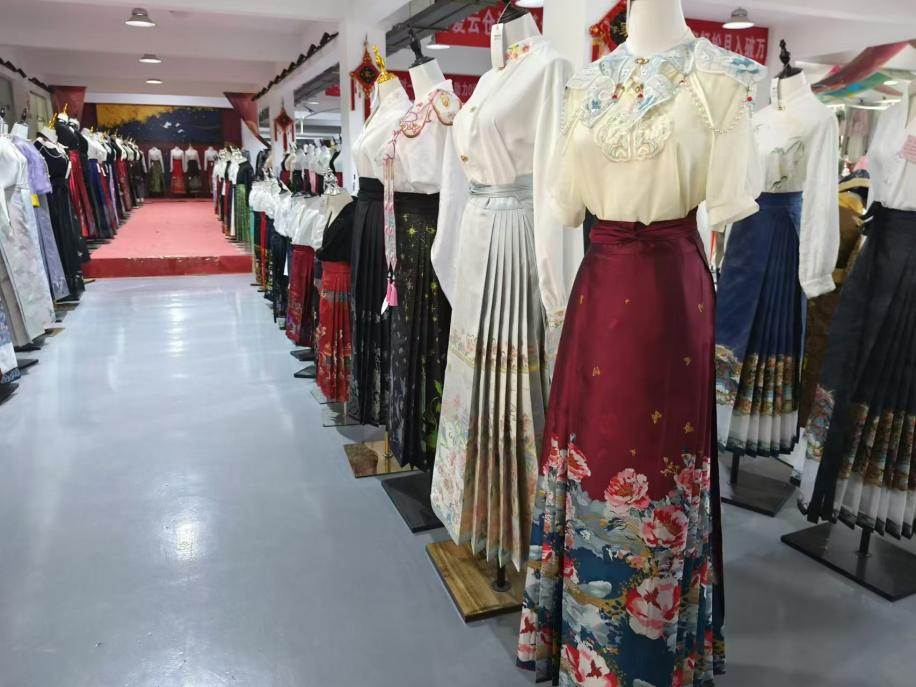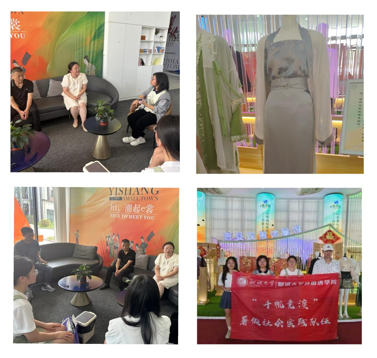 团队成员试穿了多种风格的马面裙,领略了其独到的韵味,并亲自设计图案,享受创作的乐趣,积极为马面裙的创新设计贡献智慧,助力其与现代审美完美融合。此外,实践团队与相关负责人进行了交流,了解到曹县已构建起完善的产业链,涵盖了原料供应、设计研发、生产加工、市场营销等多个环节。在对车间销售人员的采访中,团队成员得知,曹县马面裙产业在知识产权保护方面取得了显著成效,进一步提升了曹县马面裙产业的独特竞争力。