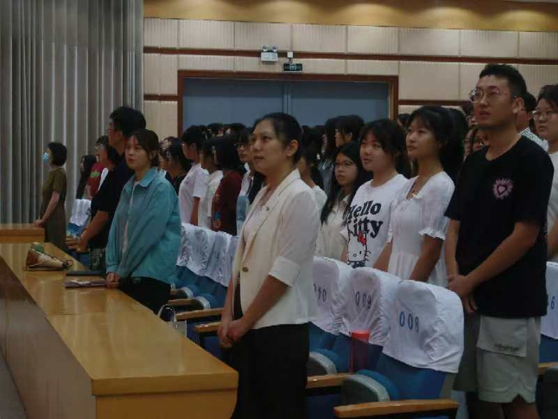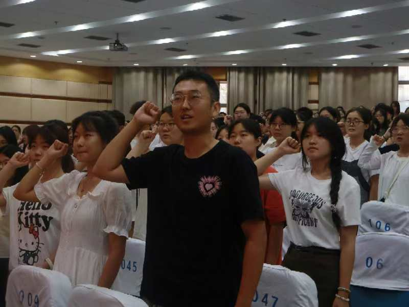 王洪月书记向新生们传达了党的二十届三中全会的精神,他强调新生要培养自身的创新意识和实践能力,志存高远,忠于祖国,为中华民族伟大复兴而努力奋斗。学院党委副书记、副院长张超老师最后寄语学生们: 要坚守初心、持之以恒,始终保持勤奋不辍、砥砺奋进的精神,书写出属于自己精彩的青春篇章。随后,全体24级新生在领誓人的带领下,高举右拳,庄严宣誓。誓言字字铿锵有力,不仅表达了新生对知识追求的坚定决心,也彰显了他们作为新时代青年的责任与担当。