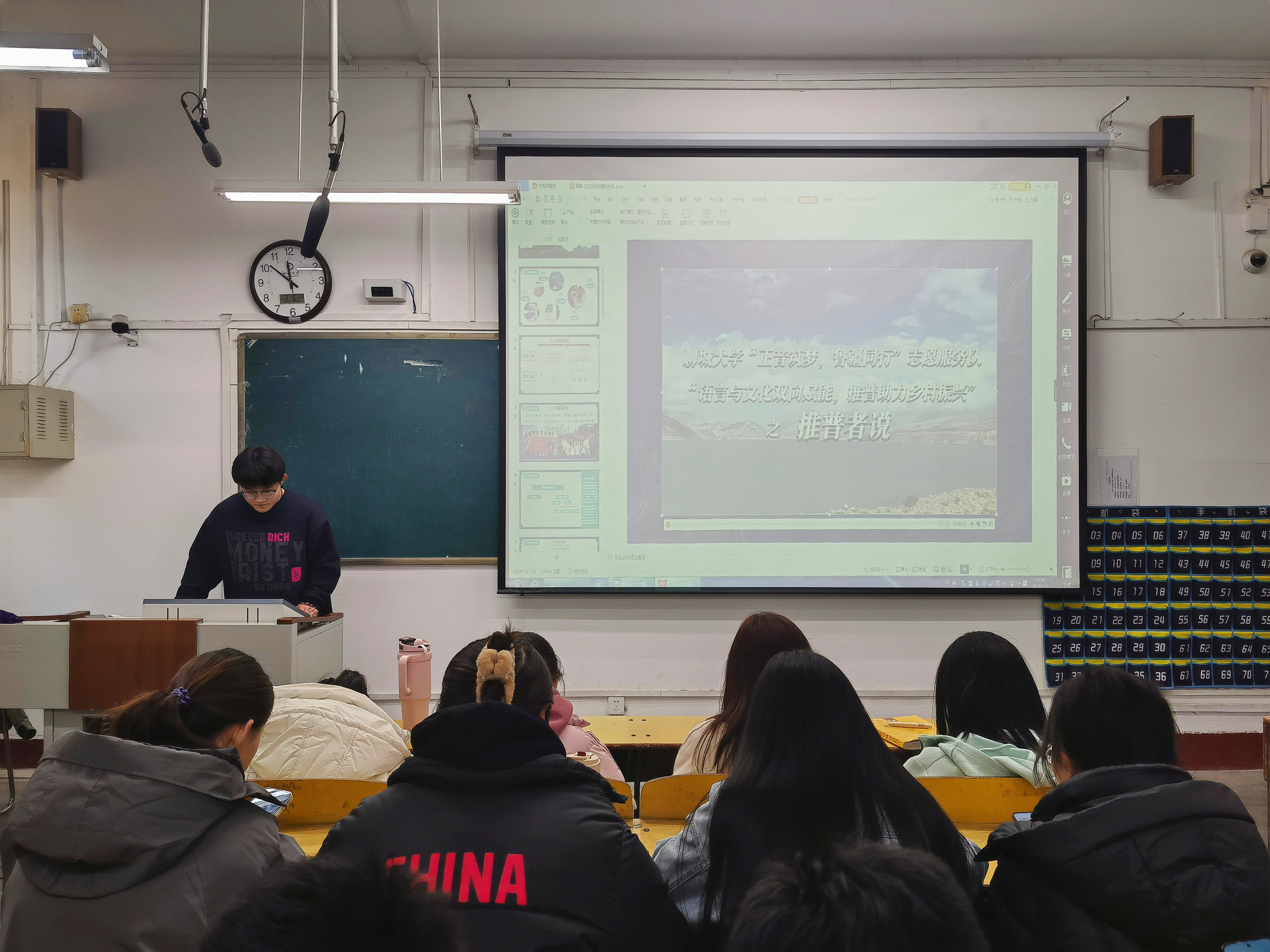 随后,他播放了一段在喀什做志愿服务时的珍贵视频,生动再现了社会实践期间的点点滴滴。在新疆,张钧凯和他的团队以弘扬齐鲁文化为己任,积极作为。从2023年至今,“正音筑梦”志愿服务队的实践先锋将学院、学校、齐鲁特色文化与当地具体实践相结合,积极组织开展各类语言传播与文化交流活动,赢得了当地民众的喜爱,并收获了政府和多家媒体的好评与宣传,大大提升了学校文化品牌的影响力。