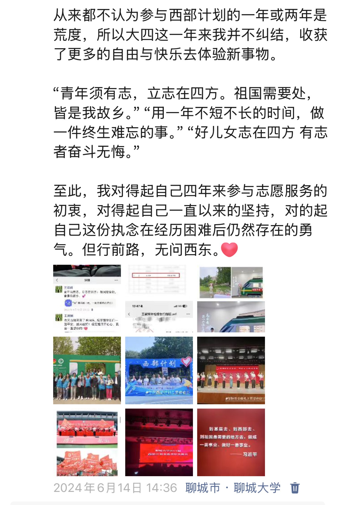 “用一年不短不长的时间,做一件终生难忘的事。”“好儿女志在四方 有志者奋斗无悔。”在聊城大学的四年里,有幸在繁森故里成长,不断接受孔繁森精神的熏陶,我对参与西部计划这件事逐渐也形成了情怀。我羡慕并且渴望成为学长学姐们那种扎根基层、奉献西部的人,于是我报名参加,有幸在24年夏天成为一名西部计划志愿者。