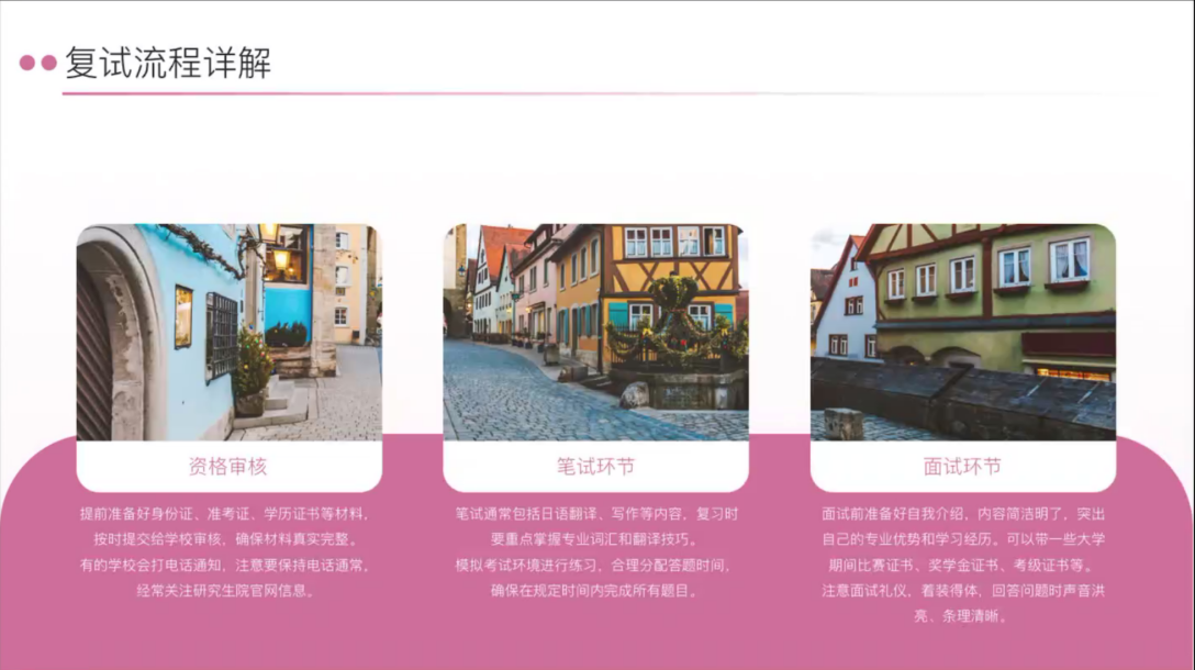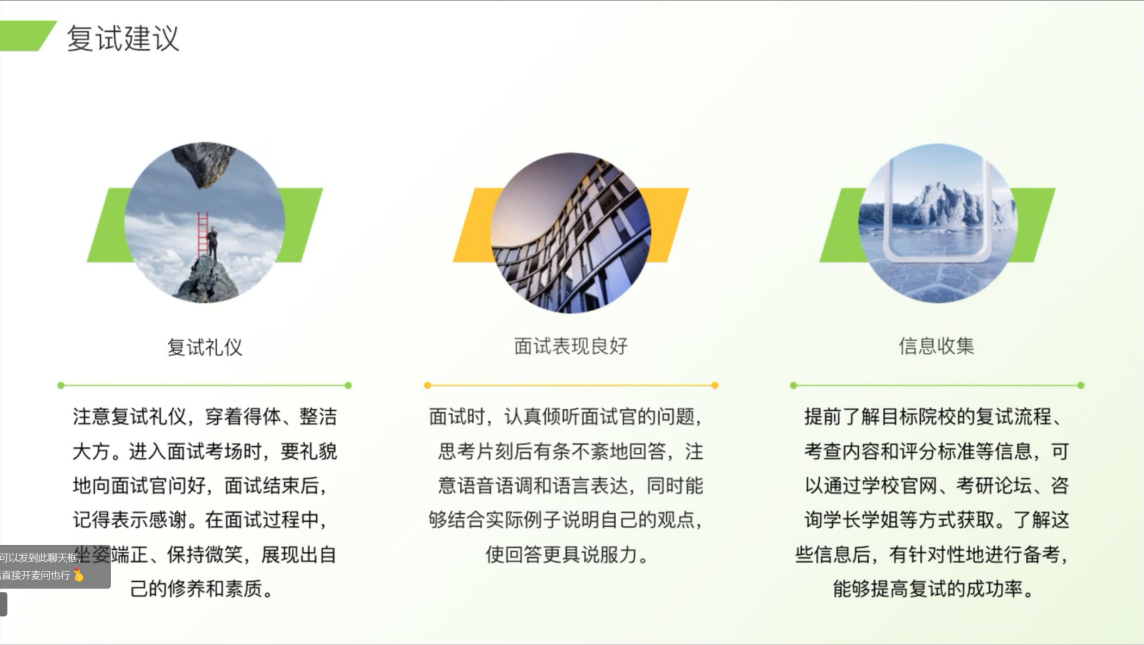 第三位分享人是上岸延边大学日语语言文学专业的王可心学姐。学姐主要为我们讲述了延边大学笔试和面试的具体内容,强调自我介绍要言简意赅,并为大家提供了详细的自我介绍模板。同时也强调了在面试过程中要着装整齐,态度端正,使用敬体同面试官对话。