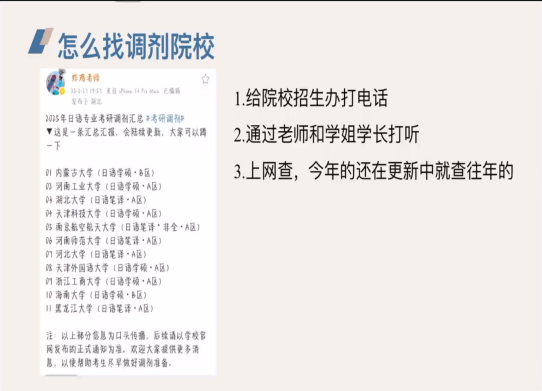 第四位分享人是调剂到黑龙江大学日语笔译专业的董王芃学姐。学姐主要讲解了调剂院校的相关内容。对怎样调剂院校和调剂怎样的院校等问题进行了系统的回答,讲述了申请调剂的流程,和如何解决调剂中遇到的各种问题,并为大家分享了复试资源和面试经验。