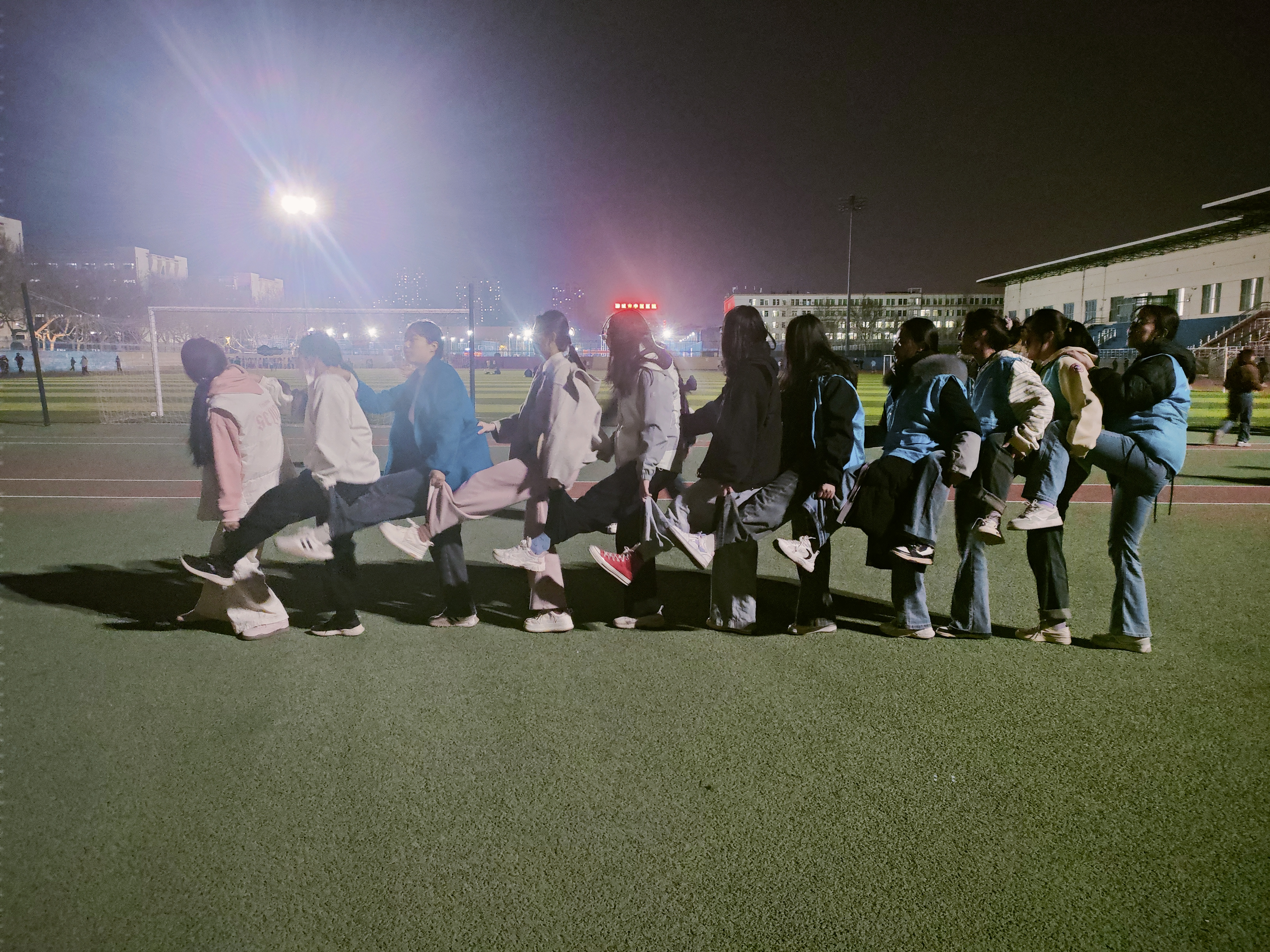 接着,“抬腿跳”活动将现场气氛推向高潮。四组学生依次排成长龙,每个队员紧紧拉住前面队员的脚踝,单腿跳跃向前。活动中,大家相互扶持、彼此加油打气,全力保持节奏与平衡,齐心协力朝着终点奋进。在克服挑战的过程中,团队情谊得以深度升华 。