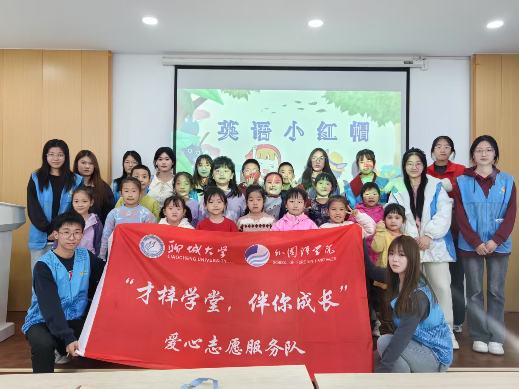 课堂中,志愿者组织了多种互动游戏,其中,“哪张卡片不见了” 游戏既切实增加了孩子们的词汇量,又锻炼了他们的反应能力。此外,他们还开展了《小红帽》英文版角色扮演游戏,孩子们分组合作,在志愿者的协助下饰演小红帽、大灰狼等角色。表演过程中,志愿者穿梭在孩子之间,微笑着给予他们鼓励和引导。