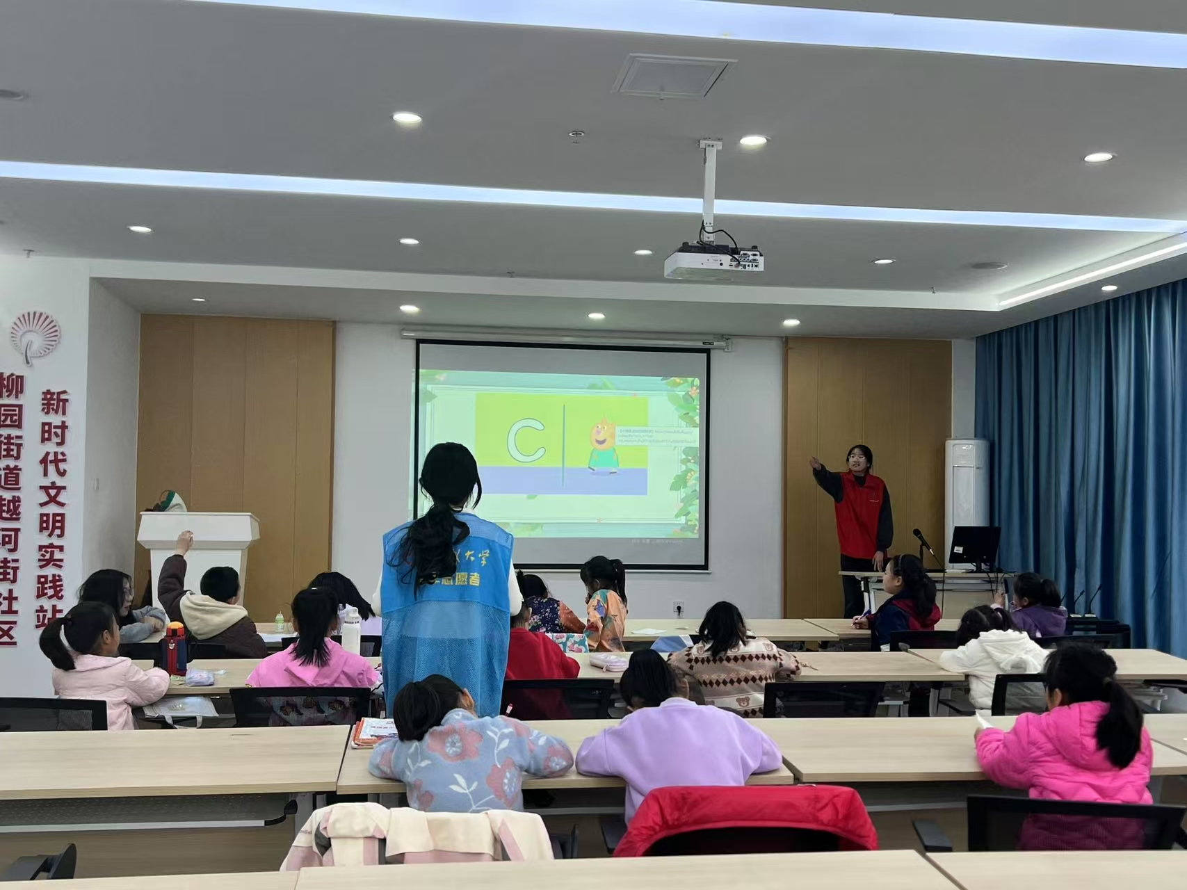 活动伊始,志愿者团队通过播放自然拼读字母歌等趣味英文动画,迅速为现场营造出轻松愉悦的学习氛围。随后,他们运用色彩鲜艳的单词卡片配合生动的肢体语言,将新单词与短句教学转化为互动游戏。这种沉浸式的教学方式极大地激发了孩子们的参与热情。