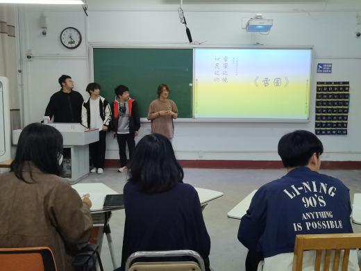 会议伊始,主持人讲解了本次读书会的评分规则并对金玉兰老师进行了简单介绍。随后,金老师作了简短发言,她希望学生们利用好读书会这一宝贵机会增进自己对日本文化的理解,并建议其在拥有一定日语基础后阅读日语原著,真正理解书籍内涵。本次读书会共有五个分享小组,他们分别选择了《源氏物语》《雪国》《我是猫》《菊与刀》《山月记》五本书进行分享。五个小组均选择使用PPT进行辅助分享,他们分工合作,各司其职,有条不紊地进行书籍及作者简介、写作背景、主要情节、主要人物、情感剖析以及心得体会的说明。五个小组分享完之后,担任评委的2022级及2023级学子向各小组分享了自己的阅读经验,并指出了各小组在分享过程中存在的问题,同时也提出了宝贵的改进建议。学生们纷纷表示受益匪浅,收获良多。