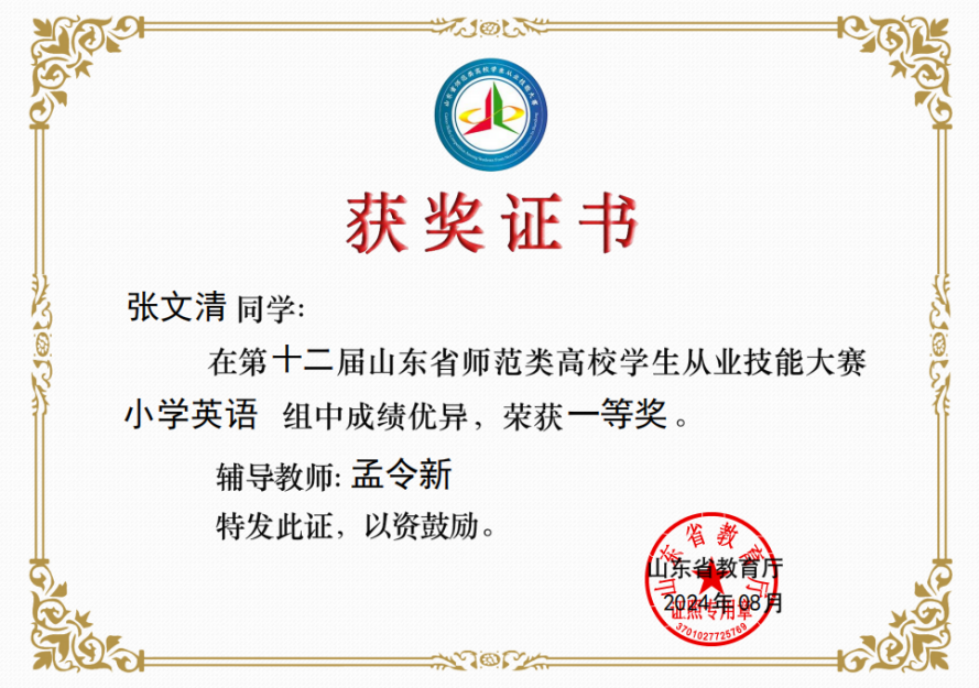 在指导学生竞赛方面,孟令新老师成绩卓著。他指导的学生在各类大赛中屡获佳绩,先后在全国大学生英语竞赛获得特等奖1项、一等奖1项,山东省师范生从业技能大赛一等奖4项,田家炳杯教育硕士教学技能大赛二等奖1项,华文杯和全国高师一等奖10余项。例如,在2024年从业技能大赛省赛中,他指导的学生张文清荣获小学英语组一等奖。