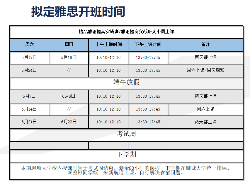 如本课程修读结束后六个月内参加雅思官方考试,总分达不到6.5分可免费参与雅思实战段;重修课程可跟读聊城大学校内新开班,或在新航道济南校区上课。