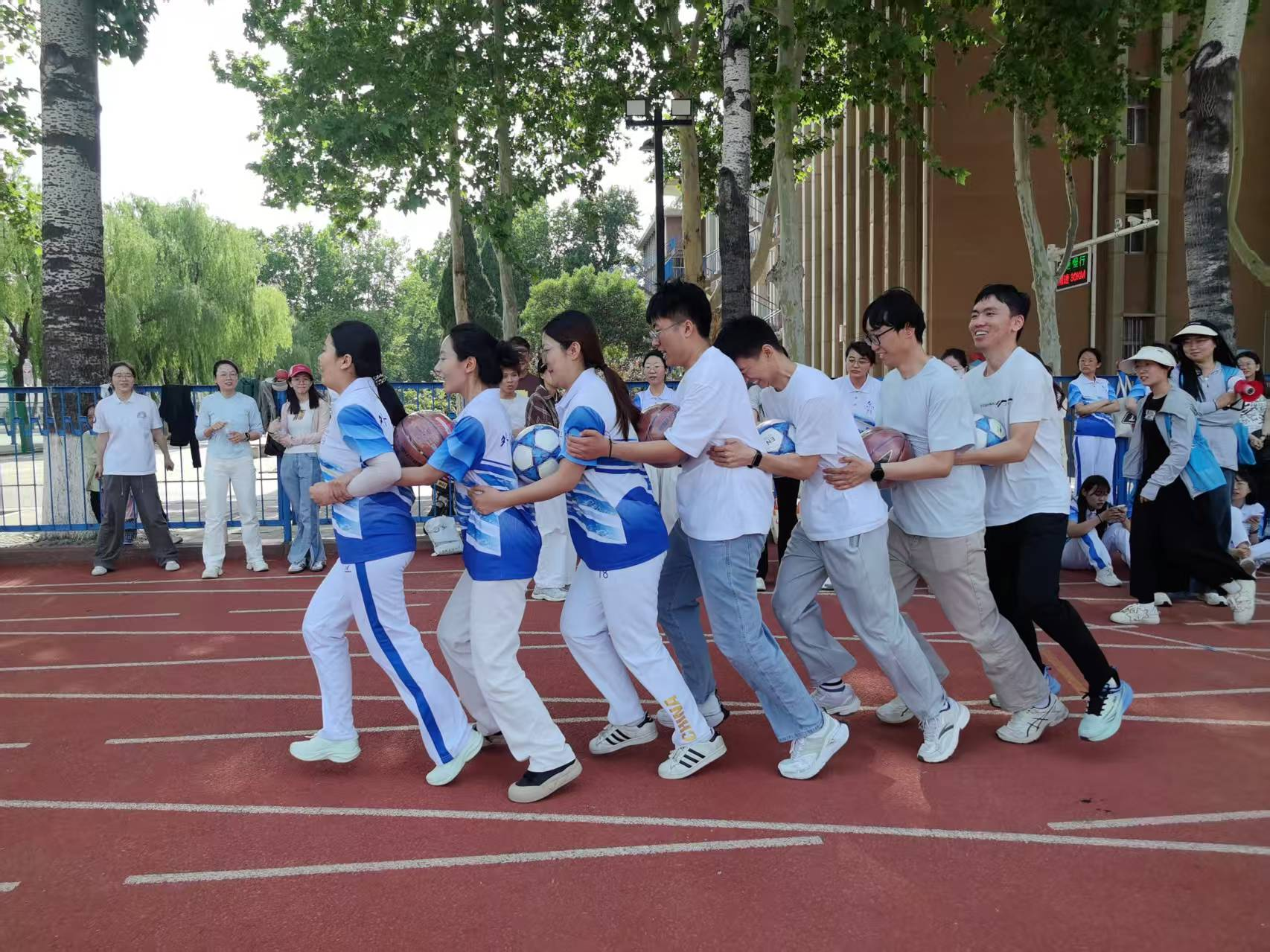 夹球协力竞走活动中六支队伍展开激烈角逐。每队队员两两夹球,步调一致地向前迈进,如同科研团队共同攻克难题般相互协作,为了团队的荣誉全力以赴。