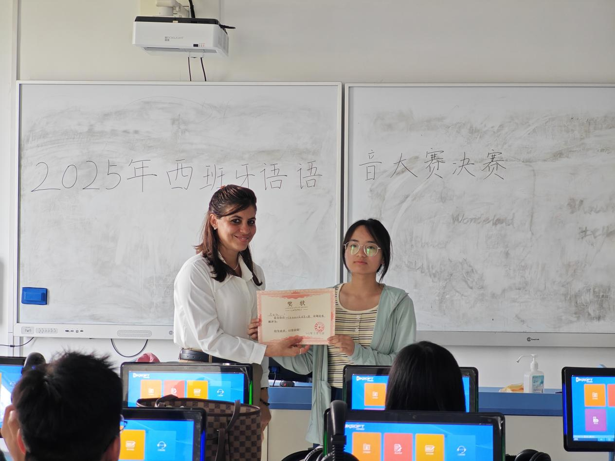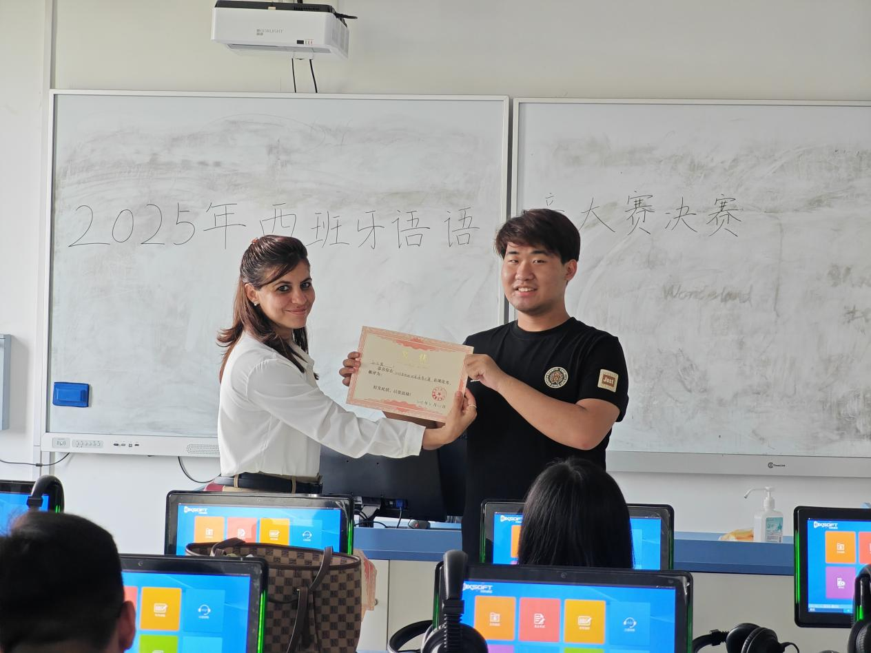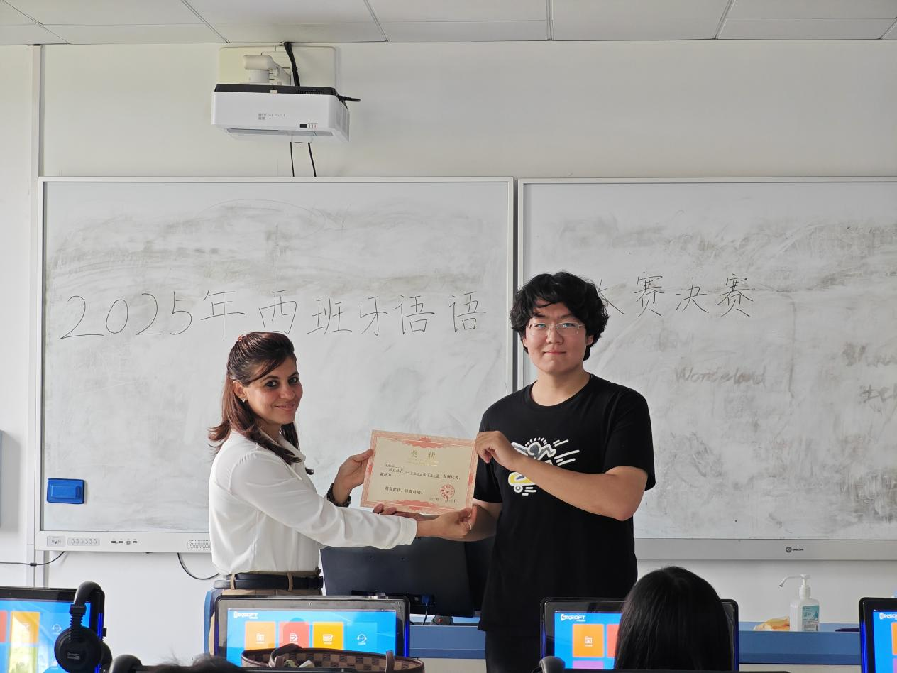 经过两轮激烈比拼,李亚欣、安烁远和孙允震以相同的成绩共获本次比赛的第一名,外教Sandra亲自为他们颁奖。同时,她向获奖选手表达了衷心的祝贺,并鼓励他们在未来继续深入学习西班牙语,感受这门语言背后的文化魅力。