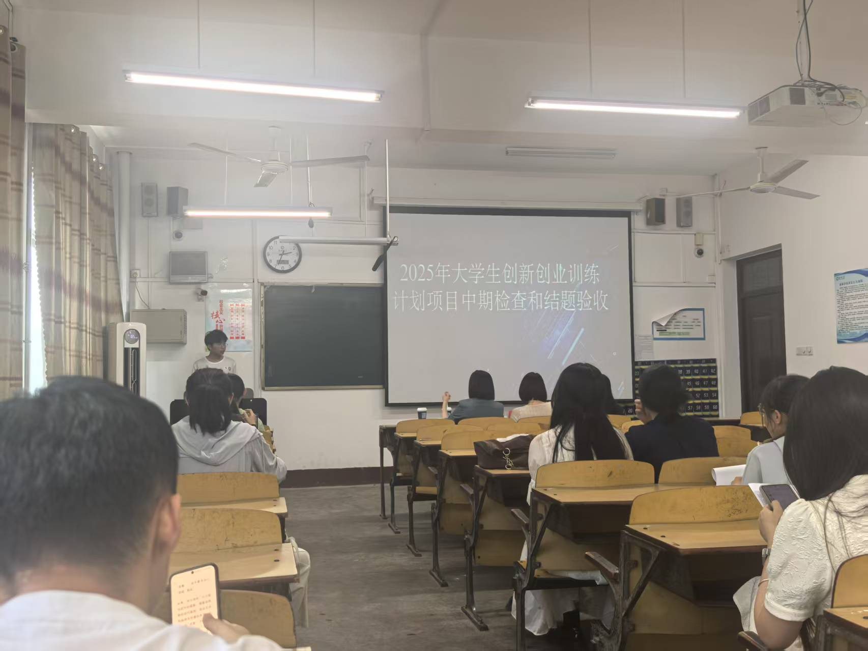 在活动组织环节中,各组答辩队伍按照抽签顺序依次上台进行轮流展示。所有项目答辩队伍严格遵循流程,先后完成中期答辩、一年期结项答辩与两年期结项答辩。答辩过程中,各组代表有序登台,首先以通俗易懂的语言对本组选题的背景意义进行普及介绍,随后结合PPT演示详细说明项目当前的进展情况,包括已完成的研究内容、取得的阶段性成果及遇到的问题,最后深入剖析选题的核心主旨与创新点,阐述项目实施的逻辑框架与实践价值。待全部答辩环节结束后,在场评审教师从选题科学性、内容完整性、表达流畅度等维度对各组表现进行全面的最终点评,并针对项目后续优化方向、成果转化路径等给出具体的指导建议,为各项目的持续推进提供专业参考。