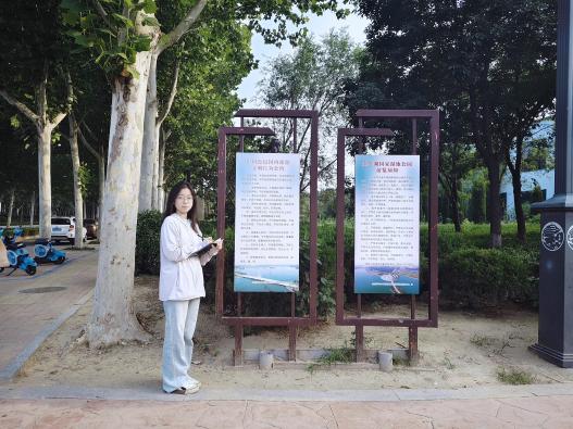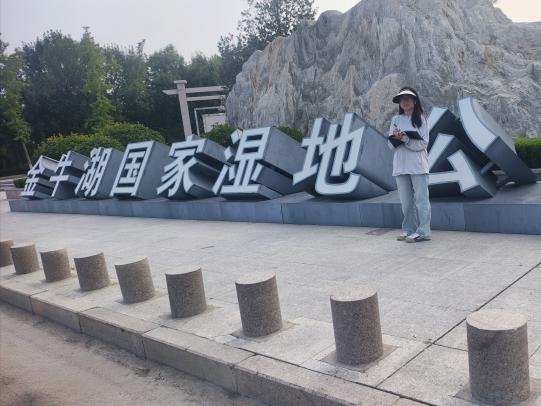 活动当日,实践队成员杨新宇携带相机、笔记本等调研设备抵达金牛湖风景区。她沿环湖步道对导览牌、景点介绍牌、警示标语等进行多模态数据采集,重点记录中英双语标识的翻译准确性、排版规范性及文化信息完整性。在环湖步道及核心景点区域,杨新宇发现部分标识牌未配备英文翻译,仅以中文单一语言呈现。例如 “金牛湖国家湿地公园” 入口处的茌平区历史人物简介牌,虽用大篇幅介绍人物事迹,但全文无英文对照,导致外国游客难以理解其蕴含的文化价值。