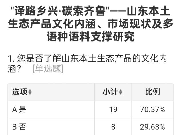 为精准匹配翻译服务与生态产品推广需求,团队设计调研问卷,面向国内消费者与从业者投放。内容聚焦对生态产品文化价值的认知、对翻译赋能产业推广的看法等维度,通过数据整合,为后续翻译策略制定与文化传播方向提供参考。