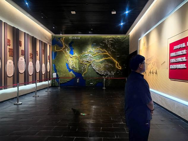 在“丝绸之路”展厅,成员们查看了丝绸之路的示意图,随后重点考察了汉代丝绸贸易文物、唐代胡人商俑、波斯银币等展品,详细记录了不同历史时期中外商业往来的具体案例,如西域香料通过丝路传入中原、中原瓷器远销欧亚的贸易路线与商业故事。
