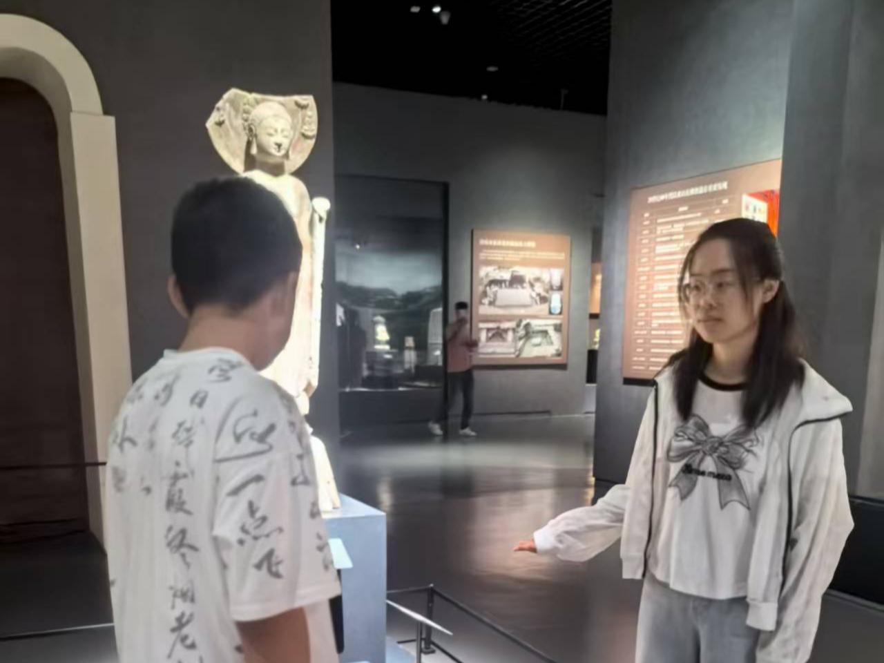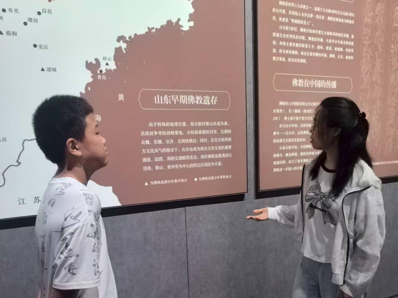 在博物馆讲解员引导下,队员有序参观“山东历史文化展”“佛教造像艺术展”“汉代画像艺术展”等展区,透过珍贵文物、古籍文献与场景复原,回溯齐鲁大地在不同历史时期的发展脉络与文化风采。通过观摩蛋壳黑陶杯、战国青铜器、汉代画像石等实物展品,翻阅山东地方史志等文献资料,结合模拟考古现场等沉浸式展陈,系统梳理了齐鲁文化的历史渊源与地域特色。