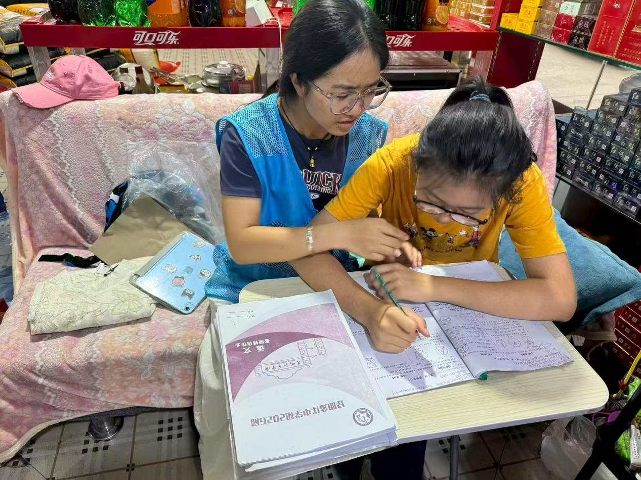 同时,针对社区内部分学生暑期课业需求,志愿者们在社区服务点搭建临时辅导阵地,为孩子们提供一对一课业辅导。从语文阅读理解到数学难题解析,从英语单词背诵到科学知识拓展,志愿者们耐心讲解、循循善诱,引导孩子自主思考、解决问题,助力他们巩固知识、提升学习能力,现场学习氛围浓厚。
