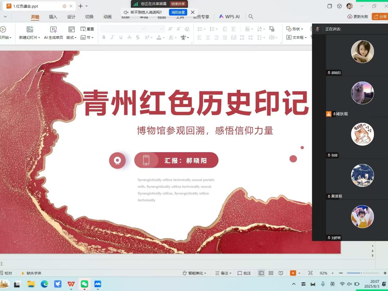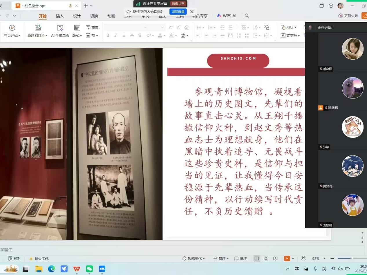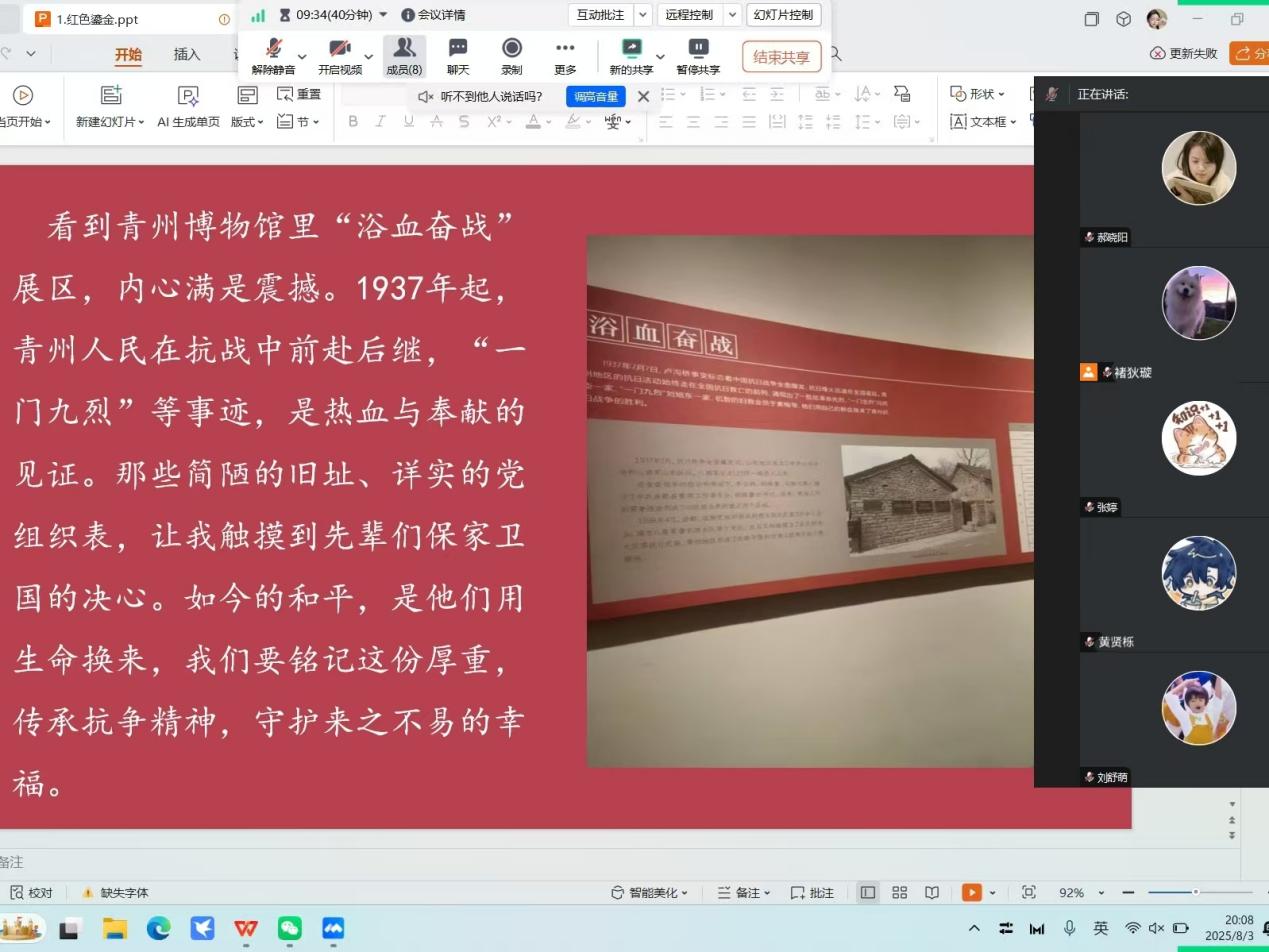 为传承红色基因,践行爱国使命,8 月 15日,73882必赢网页版“青禾暖阳”实践队线上举办“传承红色基因,践行爱国使命”爱国主题教育社会实践感悟分享活动。