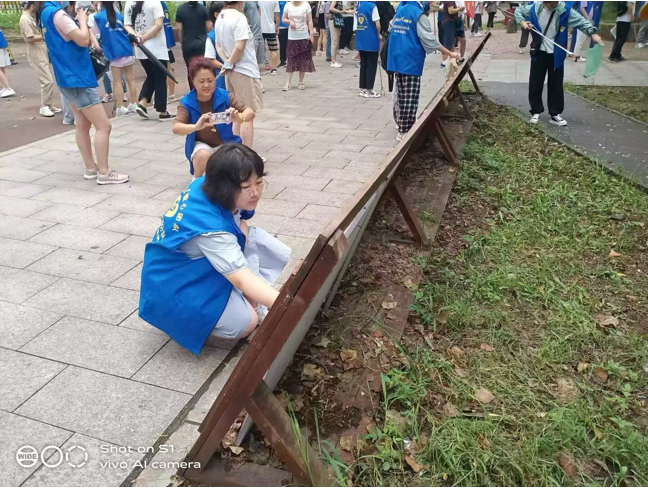 活动现场,实践队学生与社区人员分工明确、配合紧密。在社区主干道,一组学生手持大扫帚,快速聚拢落叶尘土;另一组学生用簸箕细致收运垃圾,石缝里的烟头纸屑也被实践队成员们用镊子精准夹出。小区绿化带中,学生弯腰拔杂草、用长夹子清理白色垃圾,遇深根杂草直接徒手拔除。而在居民楼楼道内,实践队学生使用抹布、水桶,协助擦拭楼梯扶手、电梯按钮等公共设施,还认真清理周边杂物,并向居民宣传消防安全与环保知识。