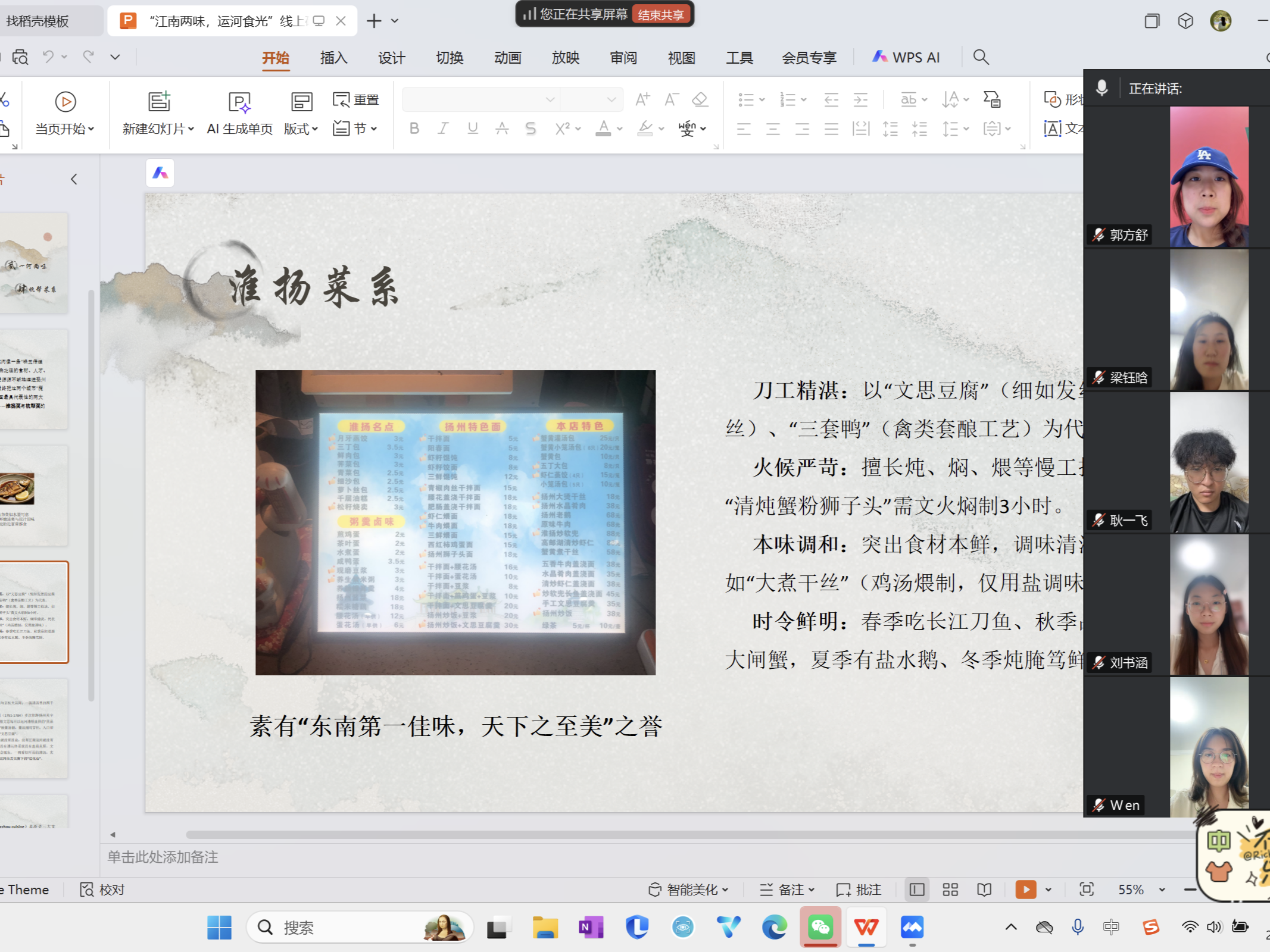 在“一河两味”专题分享中,团队成员对比解析淮扬菜“工笔细描”的精致风格与杭帮菜“水墨写意”的清雅特质,借助图文资料呈现两大菜系在刀工火候、调味理念上的差异。在菜系深度分享中,团队成员重点讲解淮扬菜“文思豆腐”的刀工绝活与漕运贡品渊源,以及“清炖蟹粉狮子头”的慢炖工艺,结合乾隆南巡历史说明漕运对御宴菜品的影响;同时介绍杭帮菜“龙井虾仁”“西湖醋鱼”等名菜的时令特色与宋韵文化背景,结合史料说明运河漕运与都城文化对菜系形成的影响。