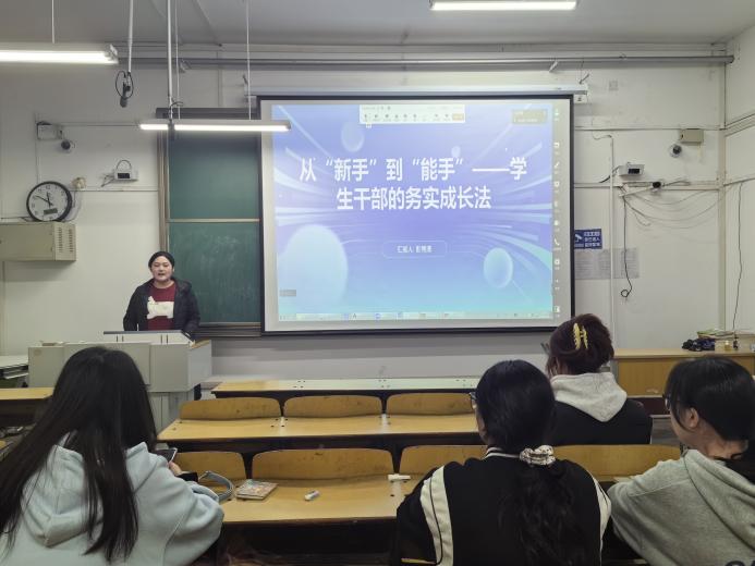 彭秀清将此次讲座分为“成长开篇”“筑基之道”“进阶之法”“淬炼之境”“成长心法”“互动共鸣”六个部分。首先,她以个人成长经历为引,详细阐述了学生干部从“新手适应期”到“多岗胜任期”的蜕变过程,强调“靠谱执行”是建立团队信任的基础,而“主动预判”则是将工作从“完成”推向“出色”的关键。另外,彭秀清列举了一些实操案例,模拟复杂场景下的工作挑战,训练学生干部在突发活动调整、多部门协作冲突中的应对能力,实现“全能本领”的掌握。彭秀清还强调了工作完成后复盘的重要性,及时复盘、认真反思可实现长期可持续成长。最后,培训会设置了答疑环节,彭秀清针对学生干部们的具体问题进行现场解答,确保培训内容“落地”。
