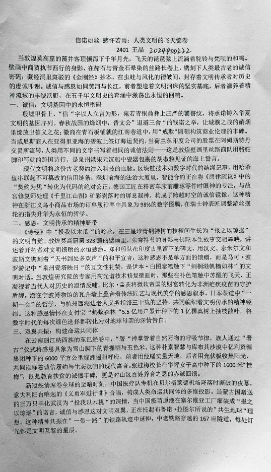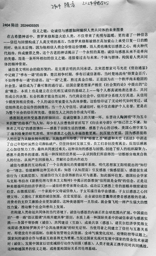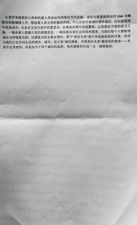 诚信和感恩是中华民族的传统美德,也是现代社会不可或缺的道德品质。本次活动目的明确,旨在进一步弘扬诚信感恩精神,培养同学们的诚信意识和感恩之心。通过激发学生的创作热情,鼓励大家以文字为媒介,讲述身边关于诚信和感恩的故事,传递正能量,共同营造一个诚信感恩的社会氛围。活动开展期间,学院充分利用线上平台的优势,积极宣传动员,为同学们提供便捷的参与渠道。全体学生积极响应,纷纷用细腻的笔触、真挚的情感,从不同角度诠释对“诚信感恩,共筑美好未来”这一主题的理解。一篇篇饱含深情的征文,记录着生活中因诚信而绽放的温暖光芒,诉说着成长路上因他人帮助而产生的感恩之情,展现出同学们对传统美德的深刻思考。本次诚信感恩征文活动意义重大。正如活动预期,其旨在通过文字的力量,传承和弘扬诚信感恩精神,让更多同学认识到诚信感恩的重要性,进而在日常生活中自觉践行这些美德。同时,活动也为同学们提供了展示才华、交流思想的平台,促使大家携手并肩,以诚信感恩为基石,共同创造美好和谐的未来。