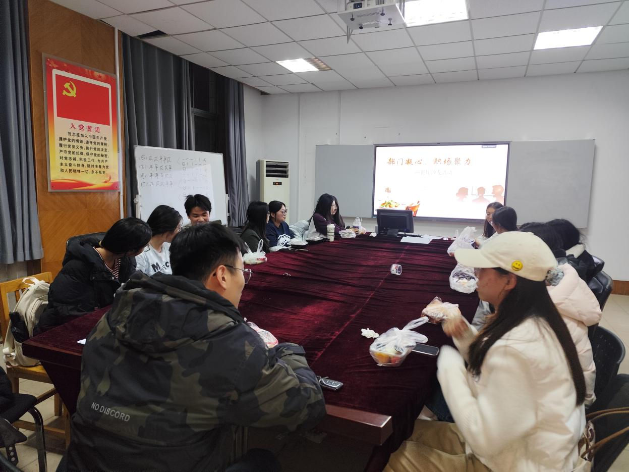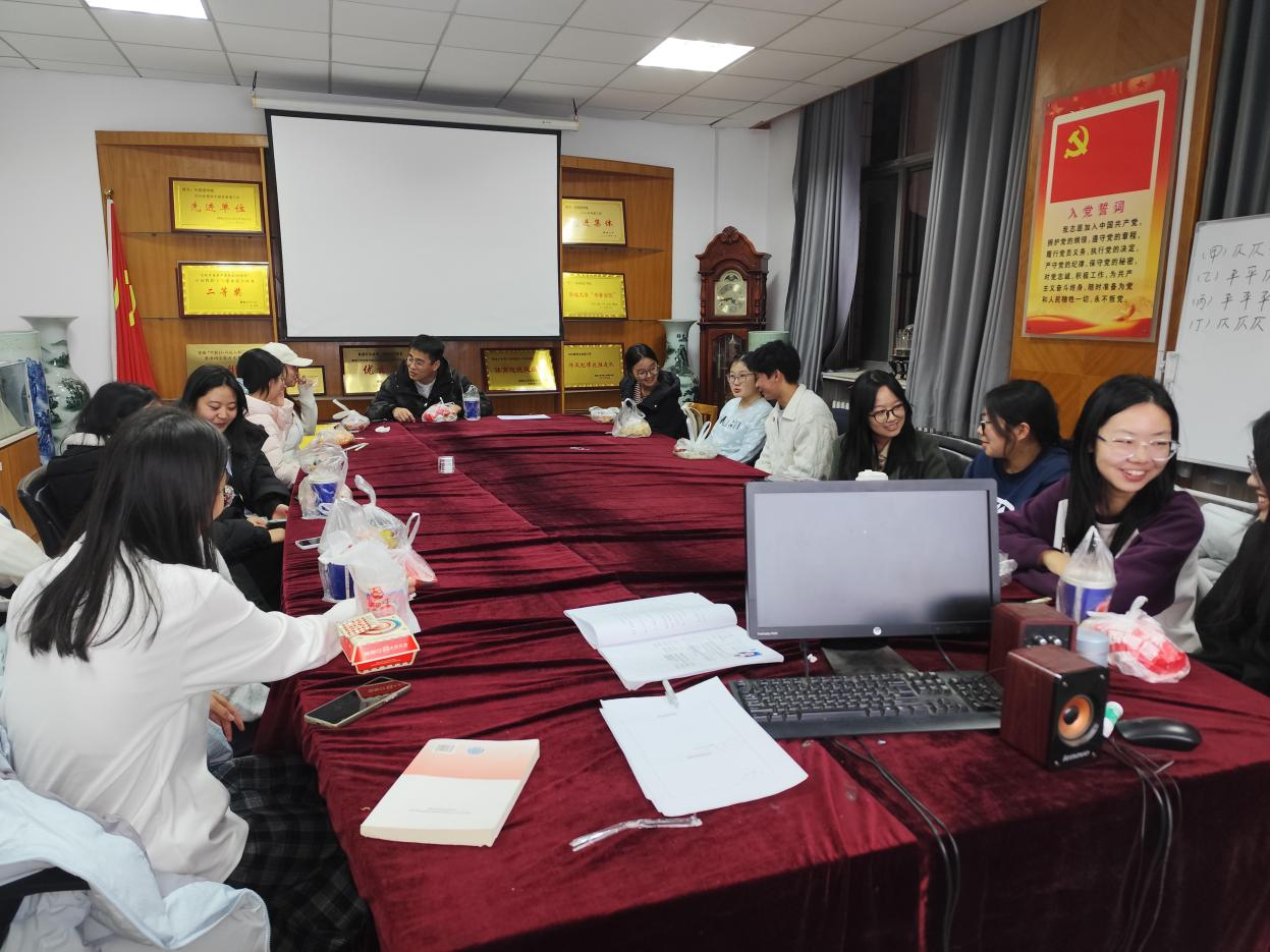 活动过程中,师生围坐交流,学生分享了近期学习、工作、生活中的趣事与困惑,例如以“近期印象深刻的生活片段”展开分享,有人聊起社团活动里的趣事,也有人坦言学业节奏加快后的焦虑;刘新成老师认真倾听每一位学生的表达,针对困惑给出了具体建议——比如用“碎片时间清单”梳理学习任务,或是通过兴趣爱好调节情绪等。现场氛围轻松融洽,同学们在美食相伴的轻松环境中放松身心,不仅拉近了同学间的距离,也消除了与教师交流的拘谨感。