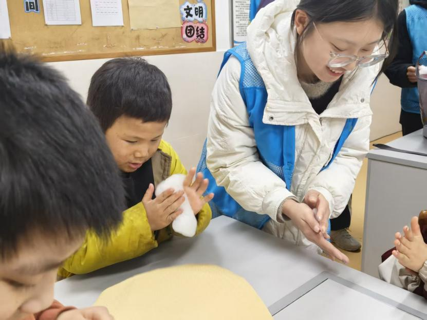 核心体验环节里,为让视障儿童“触摸”大雪,志愿者提前准备好分装至托盘的棉花、裹巾冰袋、毛绒布、松果等物品,引导儿童触摸材料,志愿者对应讲解,鼓励儿童用“软”“凉”“滑”等简单词语描述感受,现场暖意渐浓。