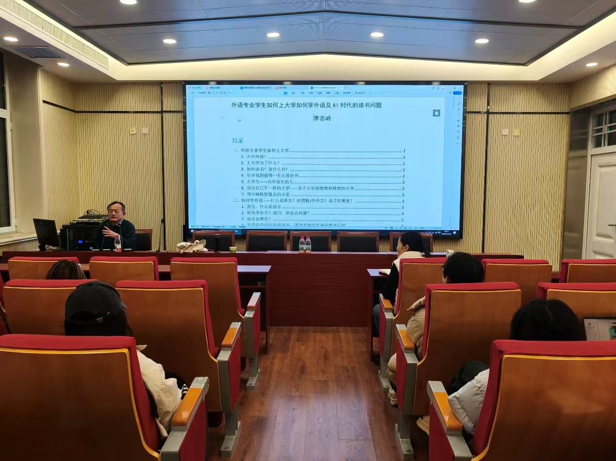 随后,李志岭教授围绕大学学习的核心意义展开阐释,他提出,上大学不仅是为了获取专业知识,更是为了通过系统学习,探寻未来人生的方向。他着重强调阅读的重要性,鼓励学生广泛而深入地读书,重视对经典文本的细读与积累,通过笔记、诵读等方式加深理解,避免“入宝山而空回”。他寄语同学们尽早发现能伴随自己一生的经典著作,通过反复研读,获得持续的精神滋养与思维训练。针对AI时代的学习新要求,李教授进一步指出,学生必须主动将专业学习与经典阅读深度融合,在实践中将语言能力转化为真正的文化沟通与思想创新能力。整场讲座引经据典,理趣兼备,将读书的重要意义贯穿于大学规划、专业学习与时代应对的每一个环节,深深激发了在场学生对读书价值的认同与热情。